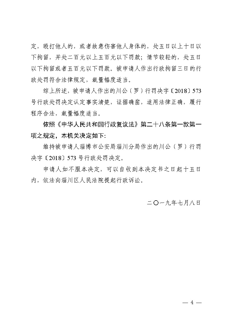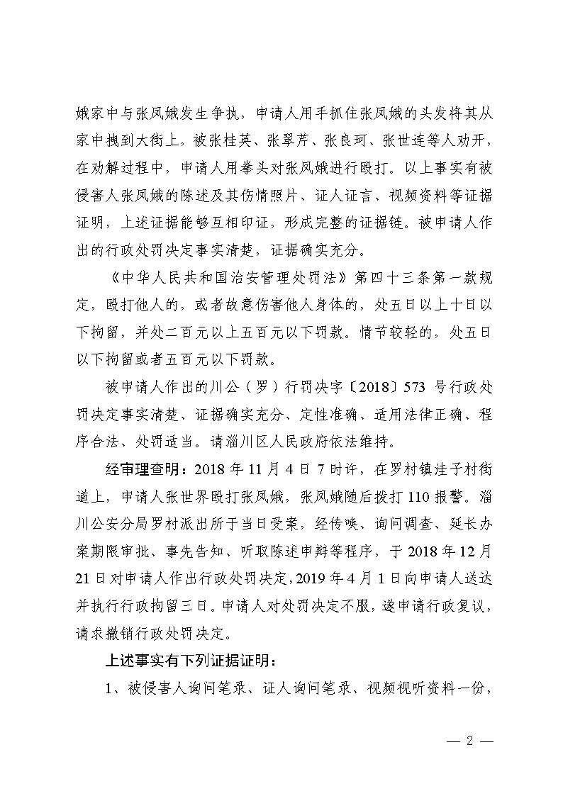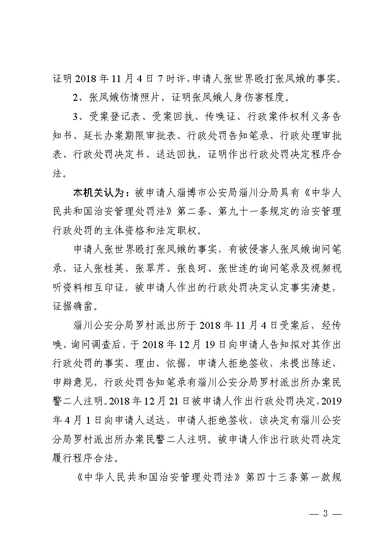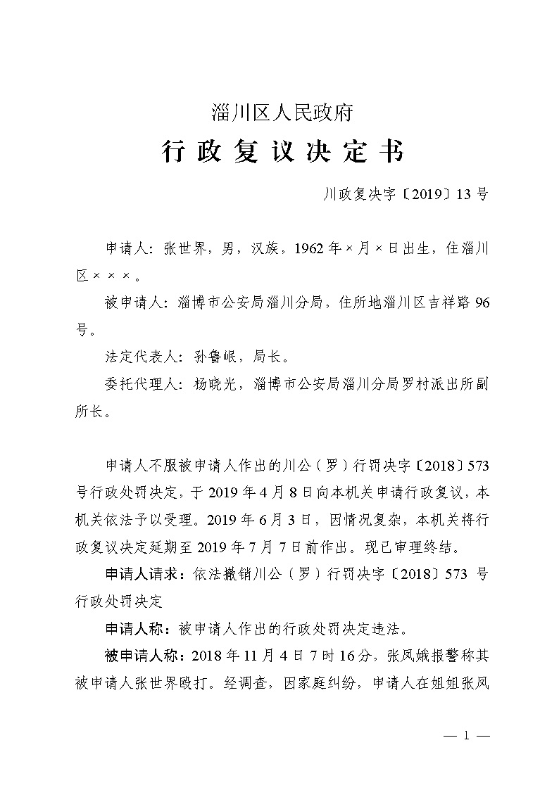 张世界与淄博市公安局淄川公安分局治安处罚行政复议决定书