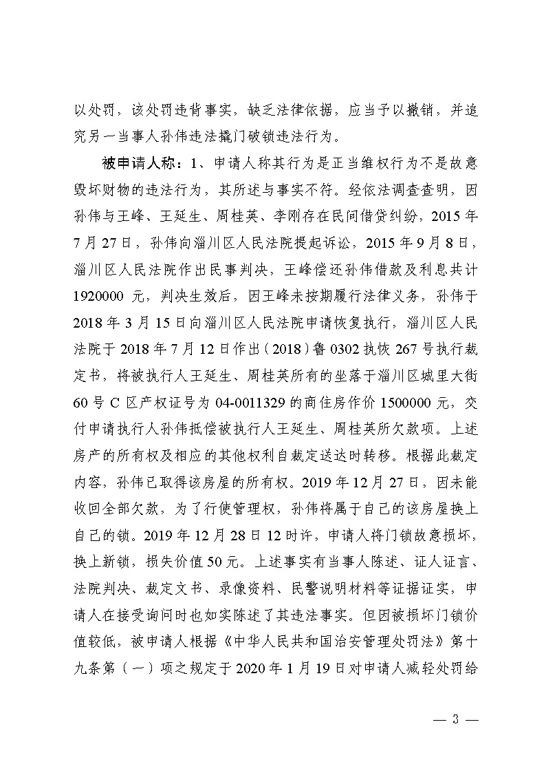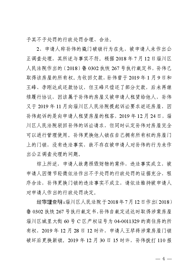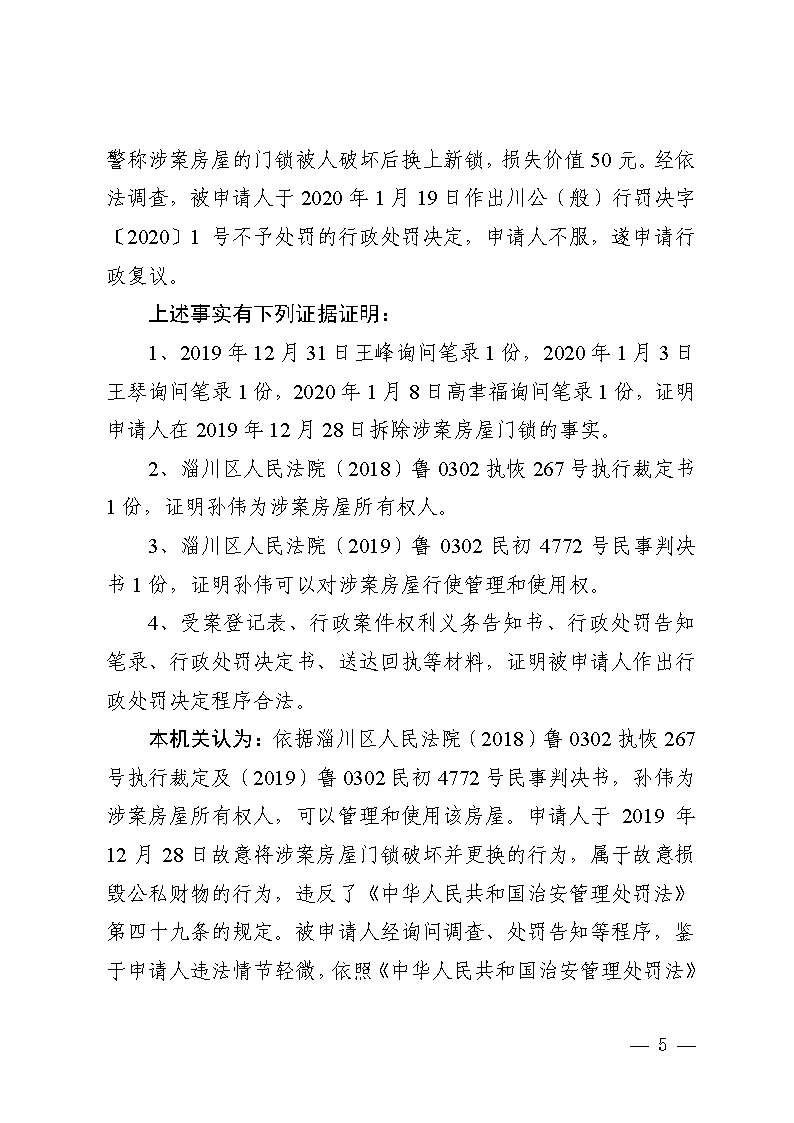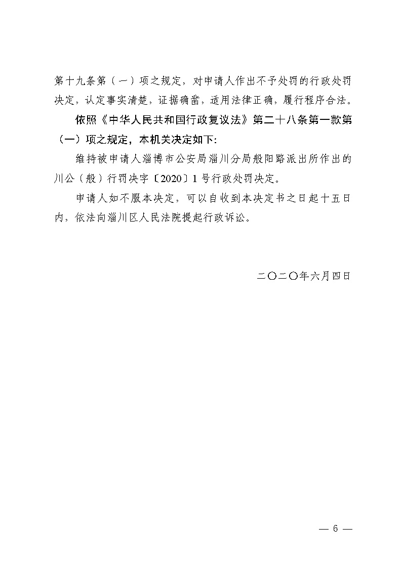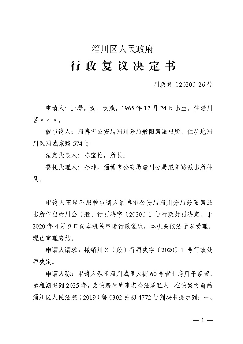 王琴与淄博市公安局淄川分局般阳路派出所治安管理行政处罚行政复议决定书