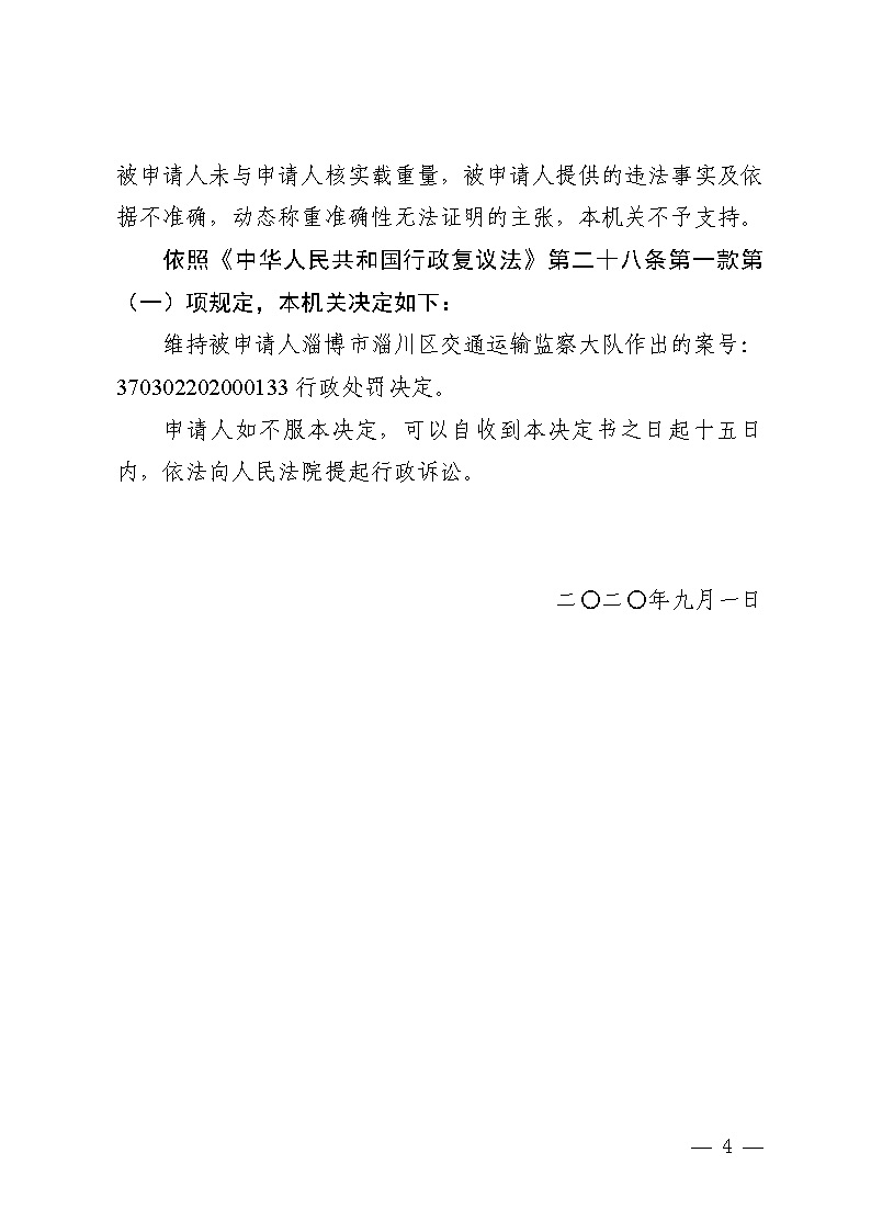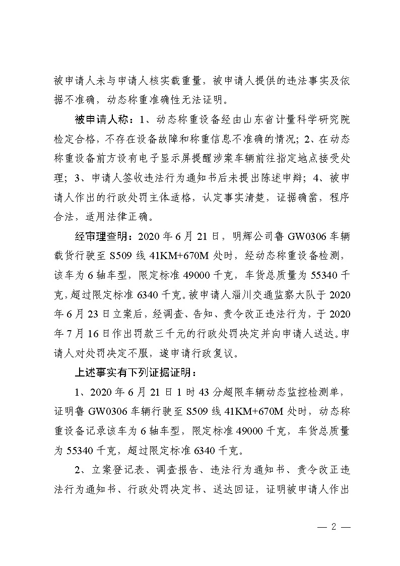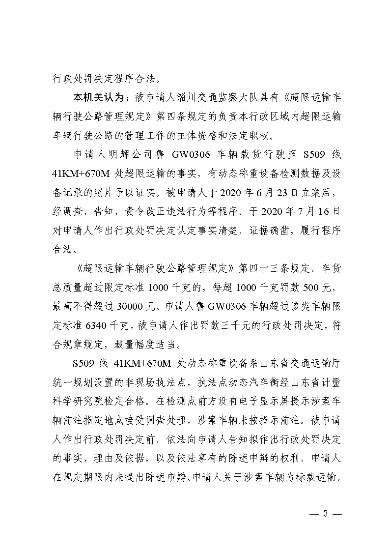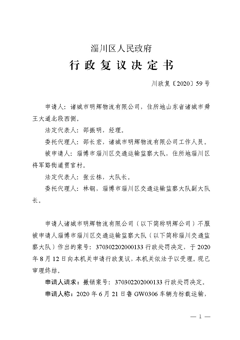诸城市明辉物流有限公司与淄博市淄川区交通运输监察大队交通处罚行政复议决定书