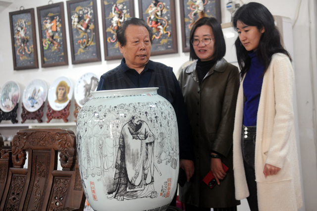 11月6日,山东省淄博市淄川区般阳路街道杏花社区,居民闫先公正在创作国画(图一)。闫先公是中国美术家协会会员、中国陶瓷艺术大师,退休后一直在家中从事绘画和陶瓷彩绘、刻瓷创作,家中处处充溢着文化气息。淄川区西汉建县,距今已有两千多年的历史,文化底蕴浓厚,是全国首批社会文化先进区和历史文化名城。多年来,淄川区通过阵地建设、组织培训、开展活动等多种途径,使文化事业和文化产业蓬勃发展,在全区形成了陶瓷、戏曲、民俗、剪纸、蛋雕、根雕、奇石等数十个文化门类,诞生了2万多家特色文化家庭,成为精神文明、新时代文明实践的助推者和社会稳定器,并有上万人成为各级各类文化协会会员。 图二、11月6日,市民在山东省淄博市淄川区般阳路街道杏花社区居民闫先公家中欣赏陶瓷作品。 作者:闫盛霆 |