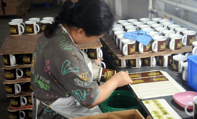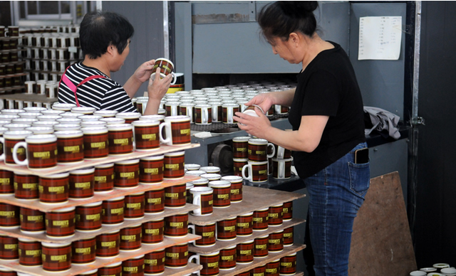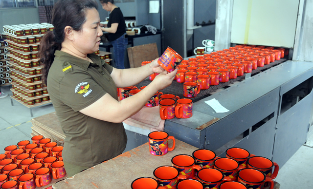 5月29日,山东淄博悦美轻工制品有限公司员工正在为咖啡杯贴花。