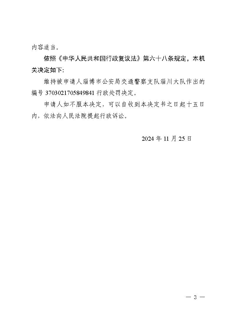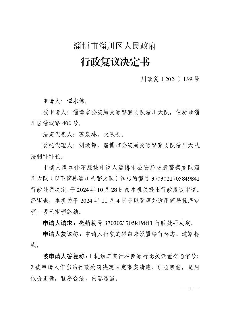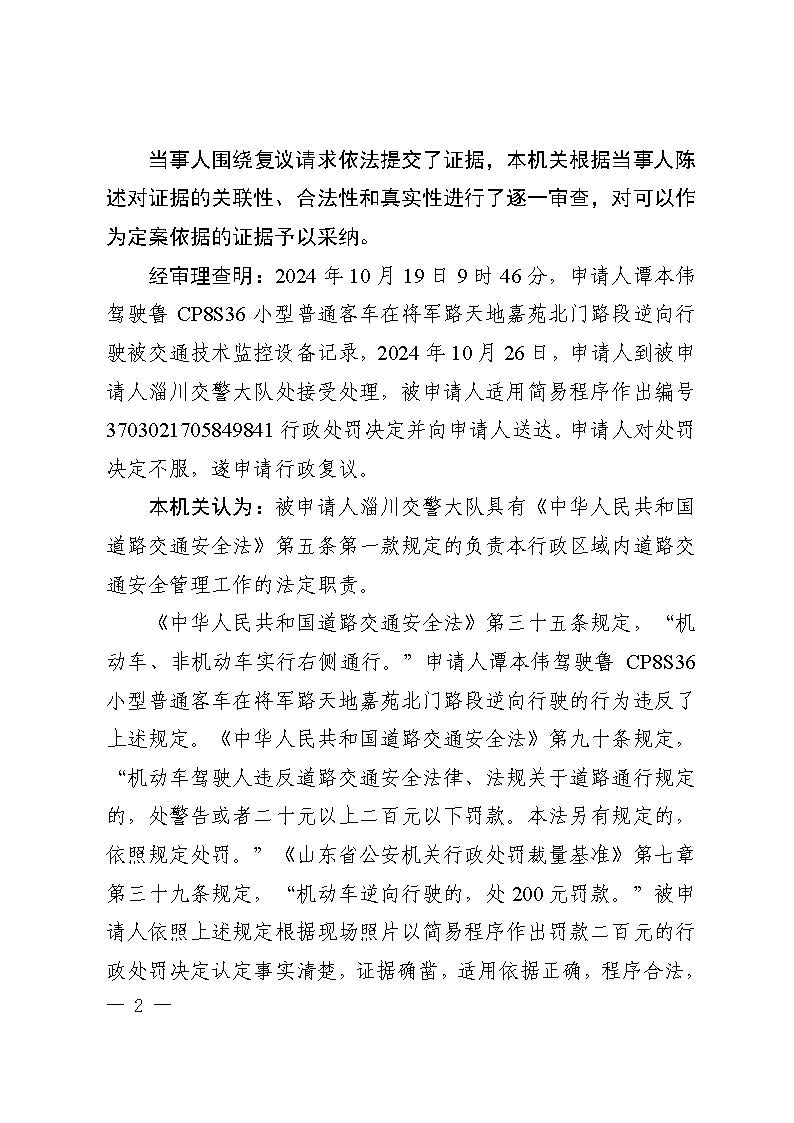 谭本伟复议淄博市公安局交通警察支队淄川大队罚款行政复议决定书