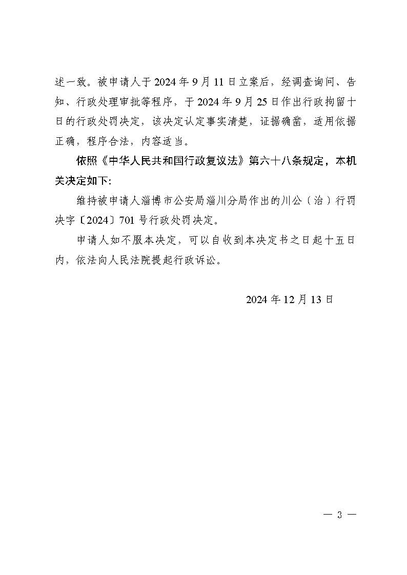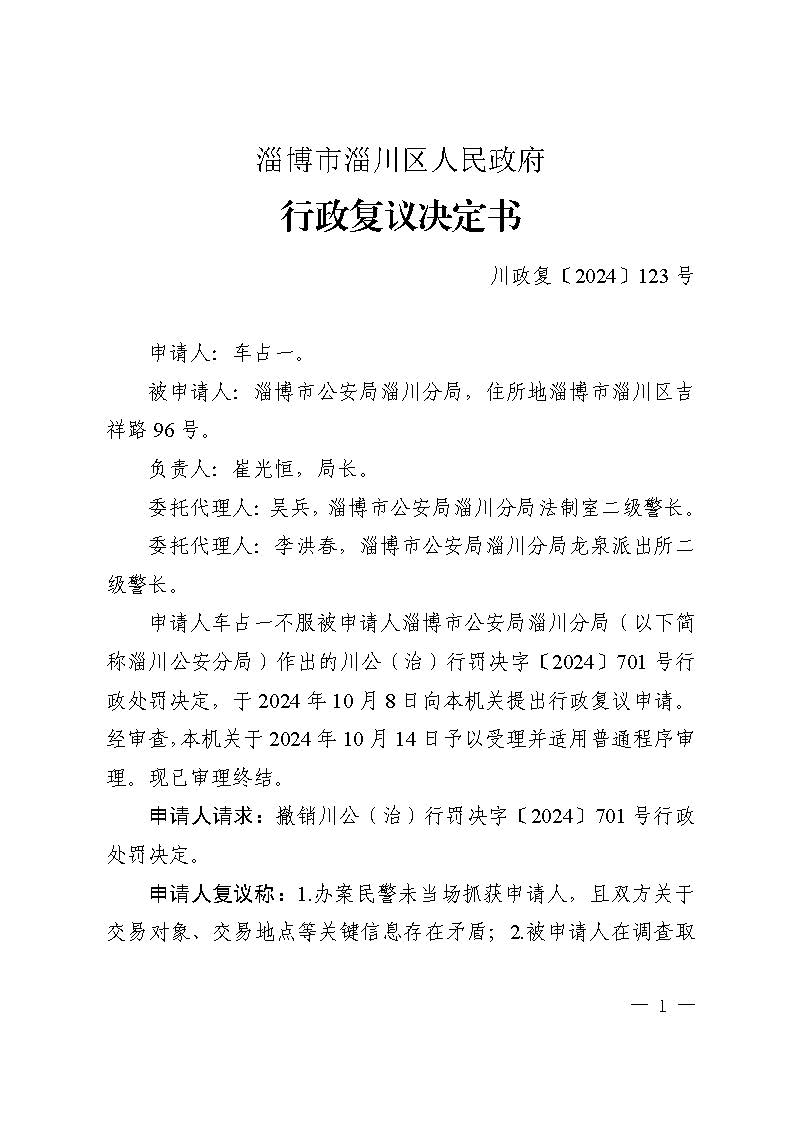 车占一复议淄博市公安局淄川分局行政拘留行政复议决定书