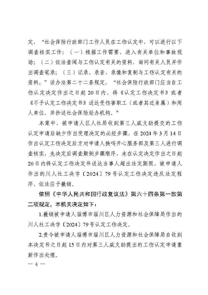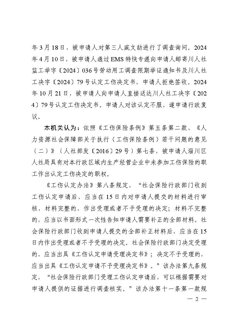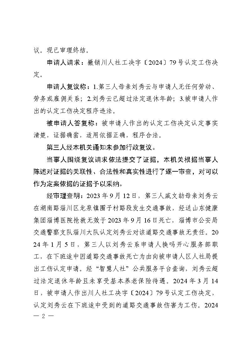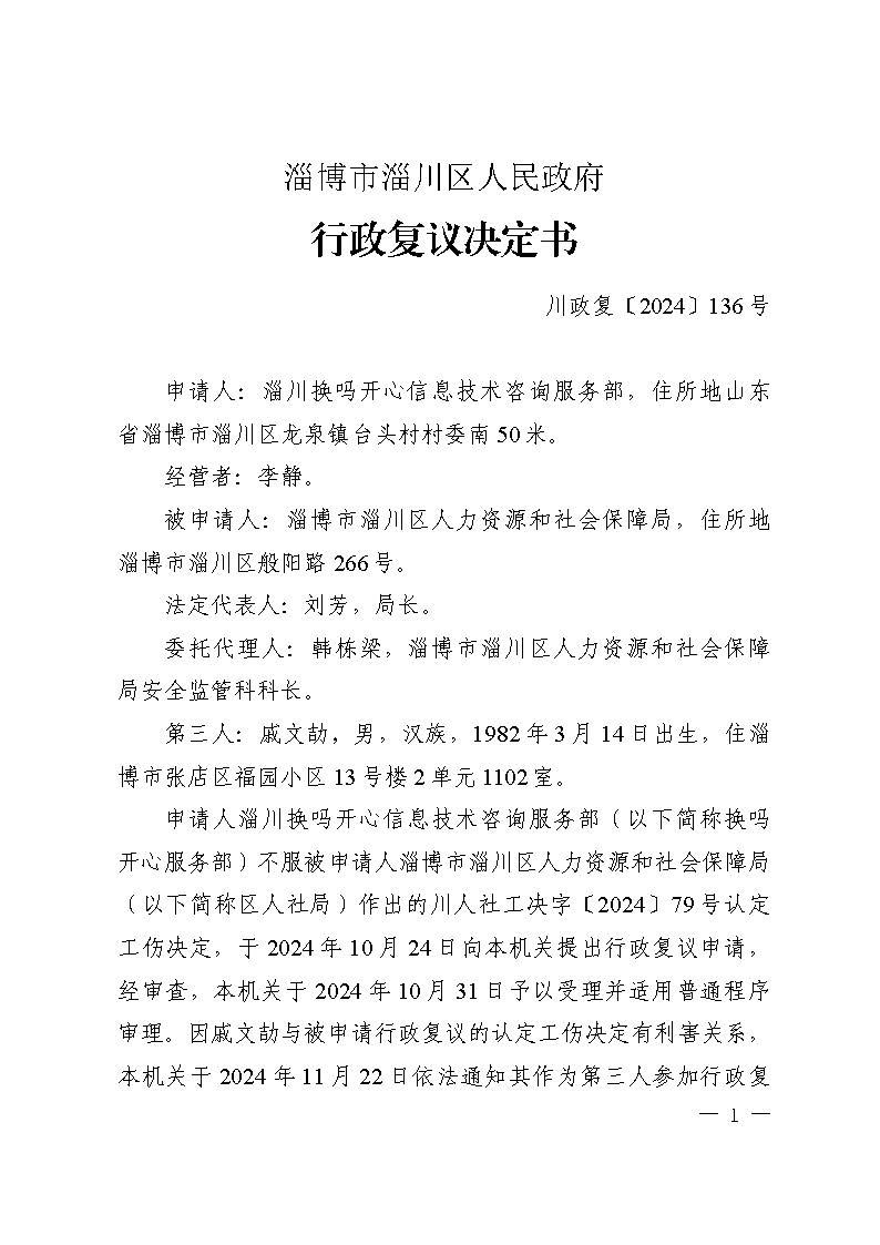 淄川换吗开心信息技术咨询服务部复议淄博市淄川区人力资源和社会保障局工伤保险资格认定行政复议决定书