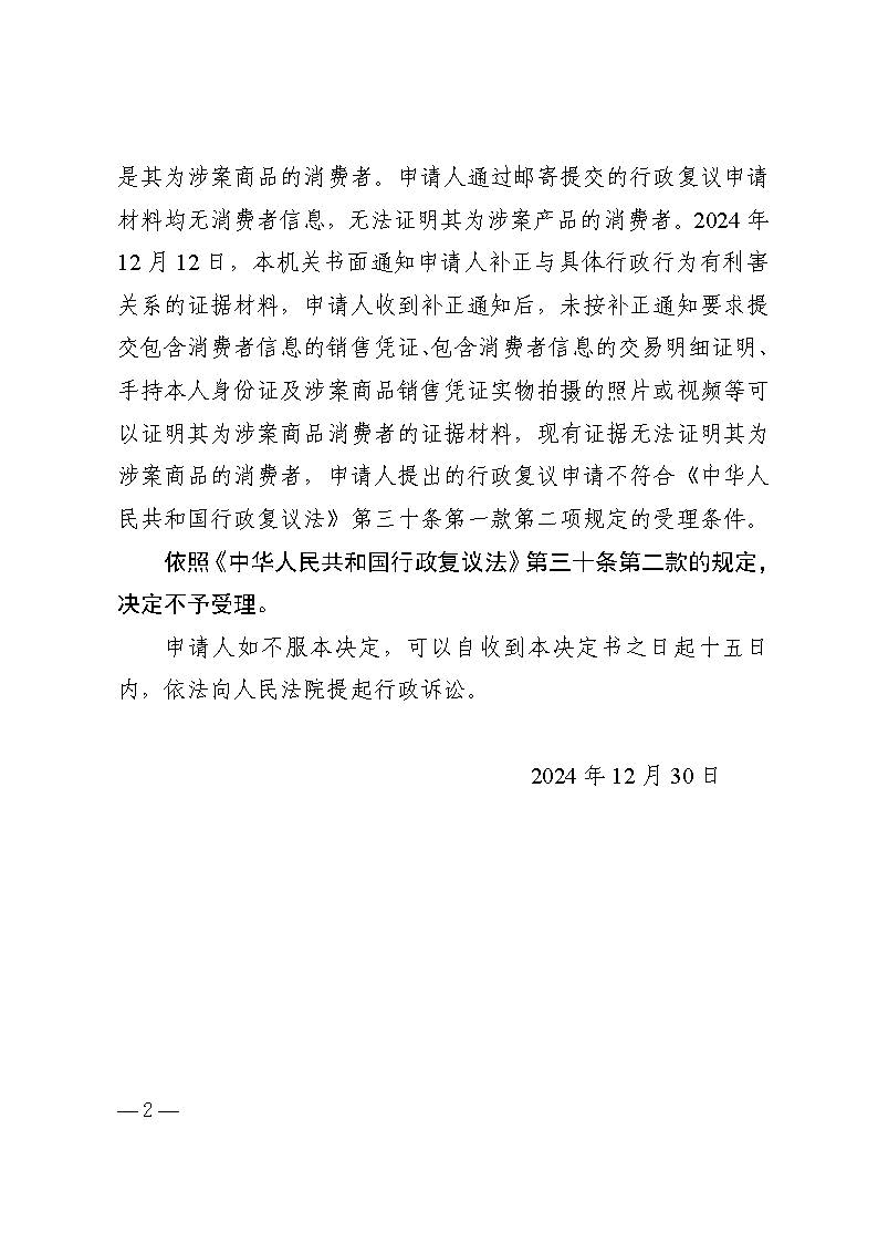 巫自展复议淄博市淄川区市场监督管理局不履行举报投诉处理职责行政复议不予受理决定书