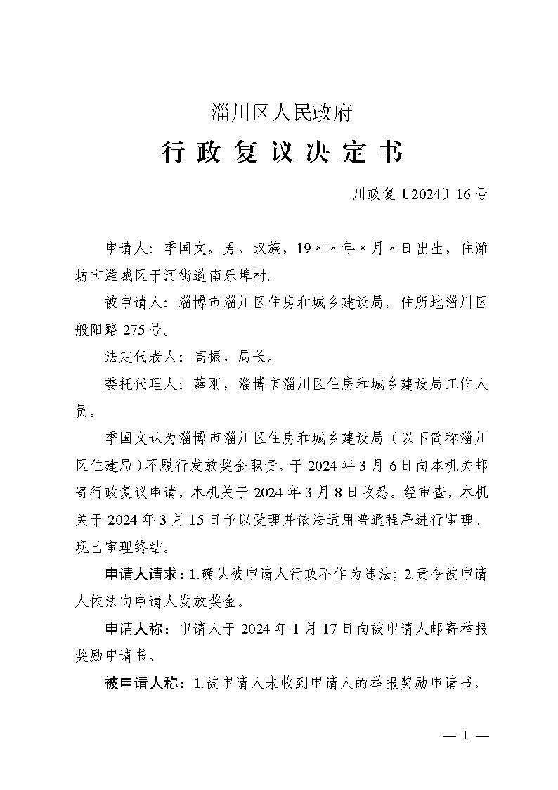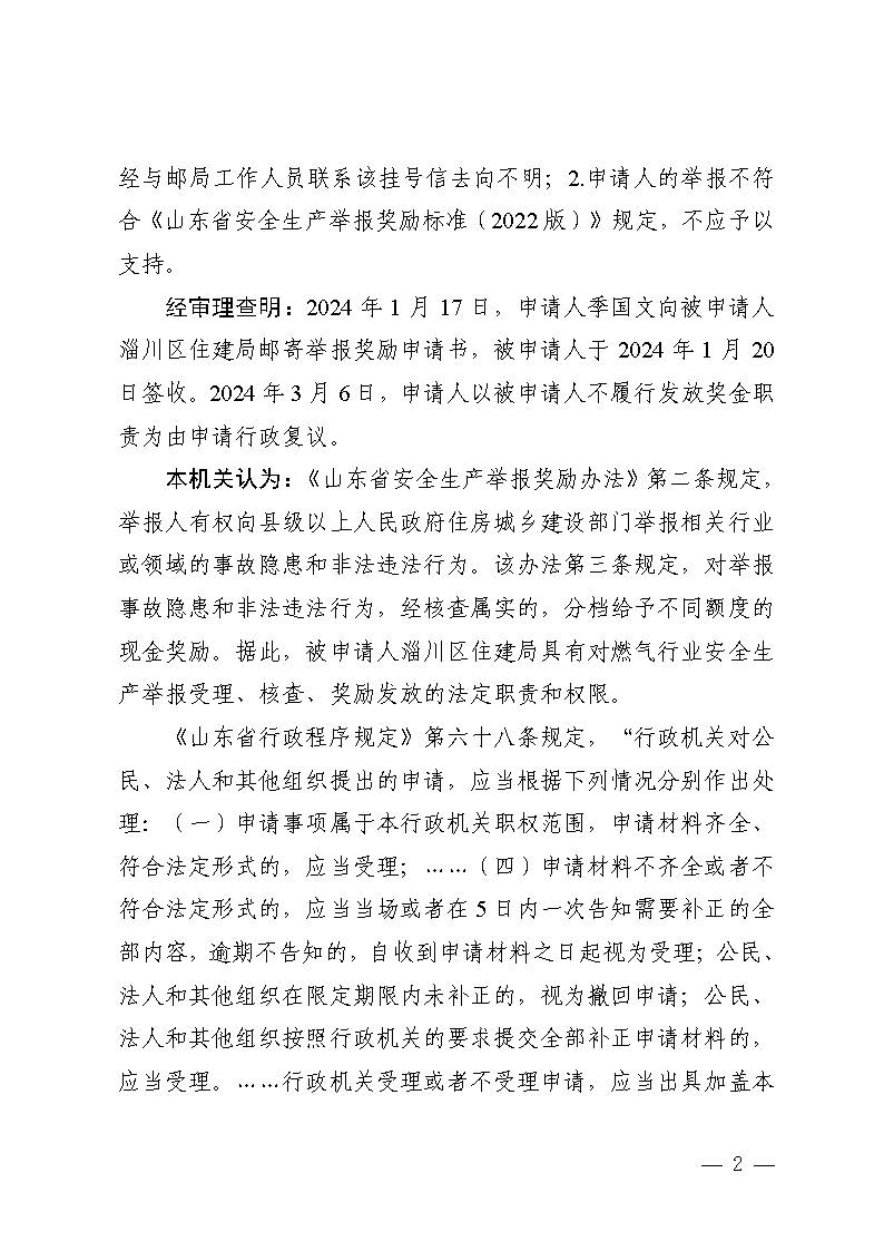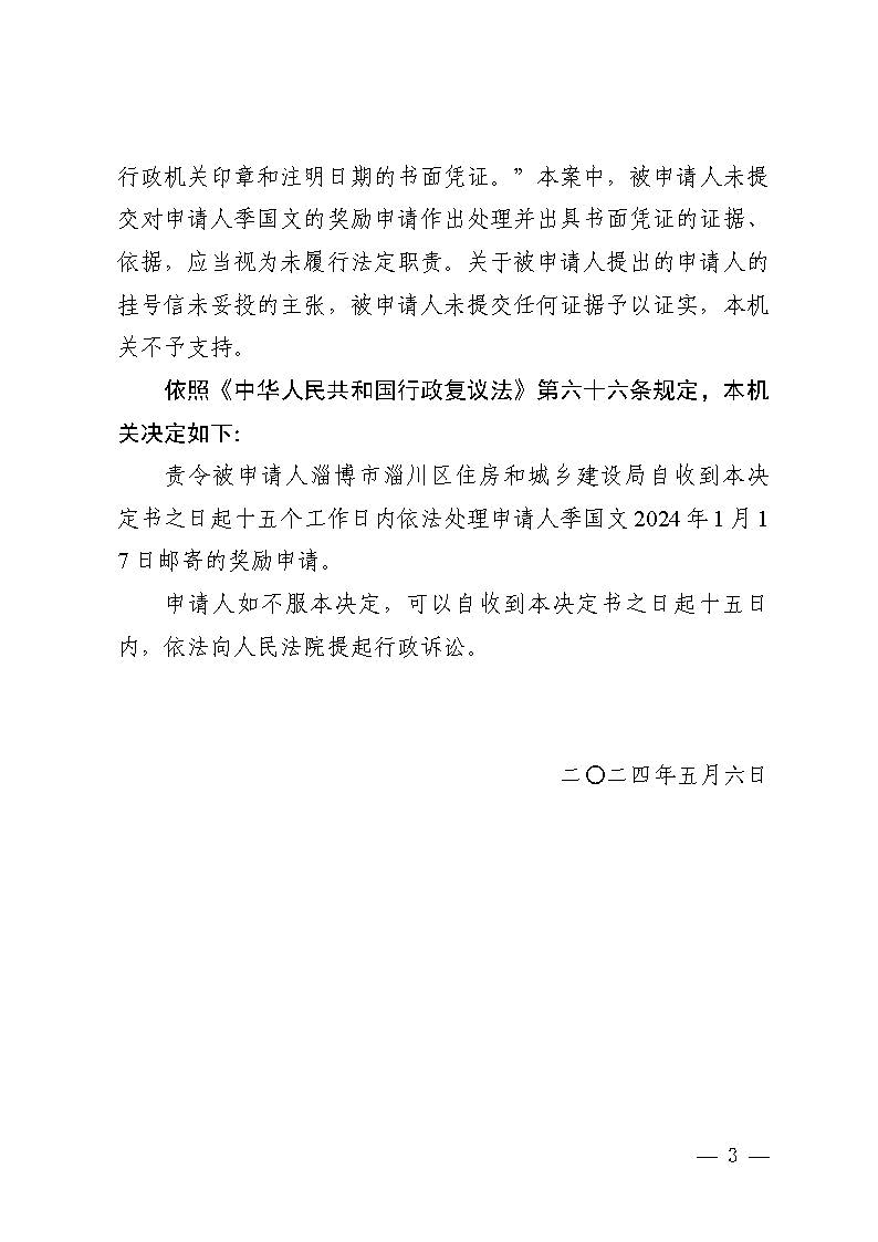季国文超复议淄博市淄川区住房和城乡建设局不履行发放奖金职责行政复议决定书