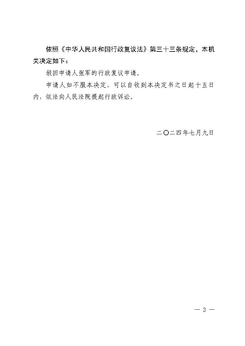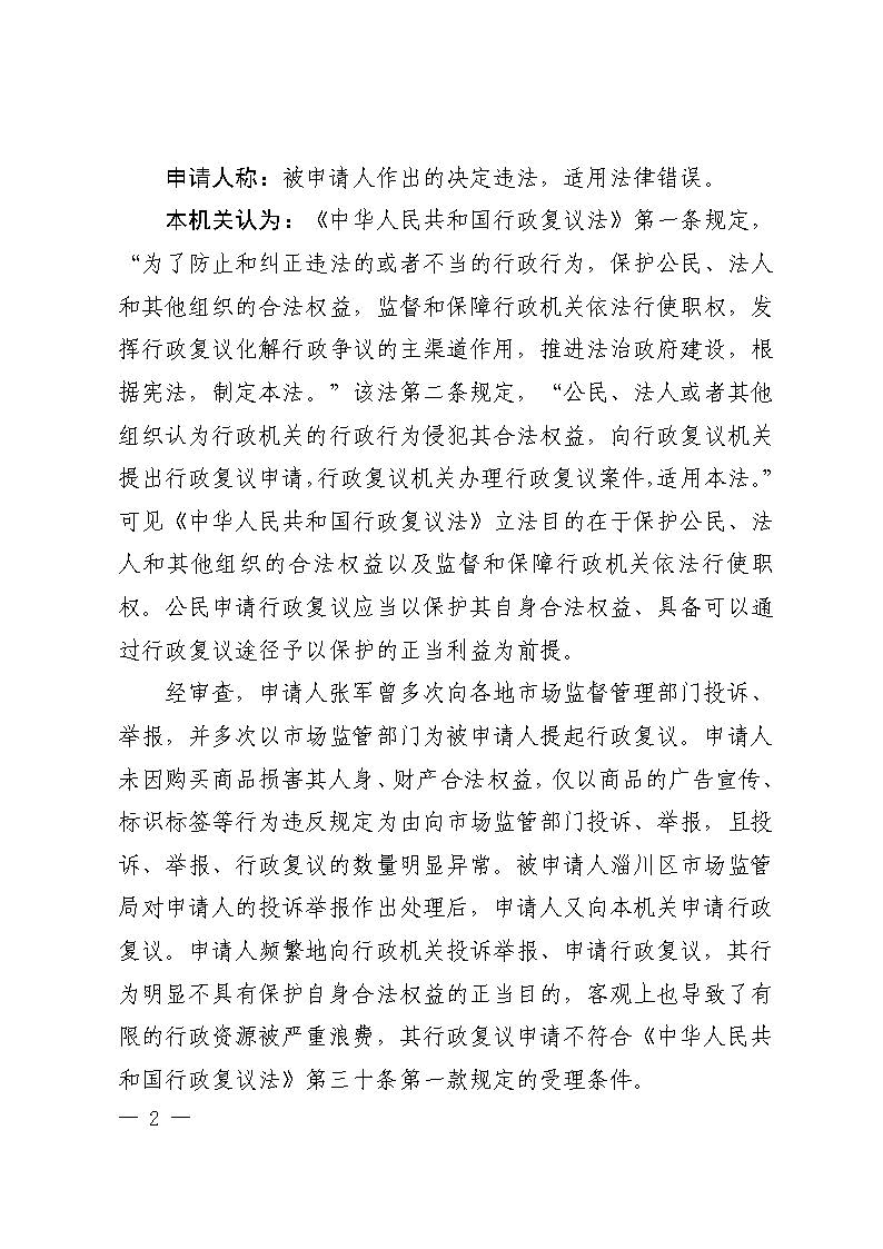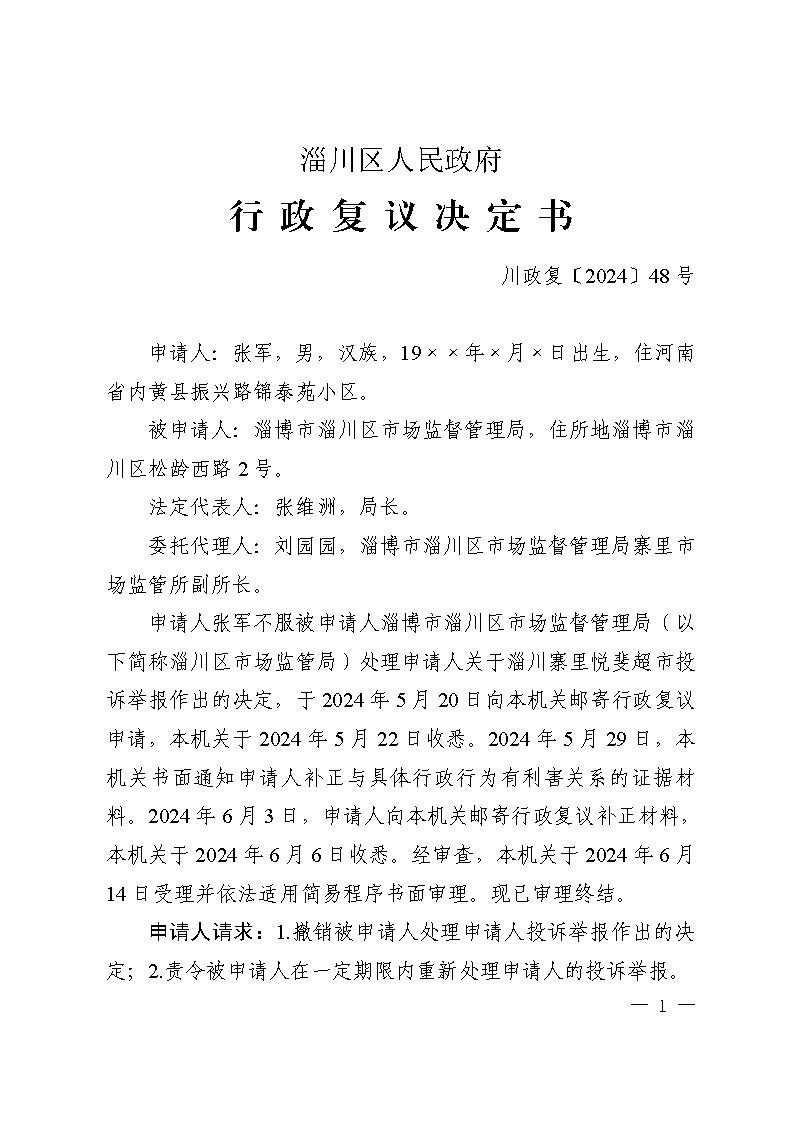 张军复议淄博市淄川区市场监督管理局举报投诉处理行政复议决定书