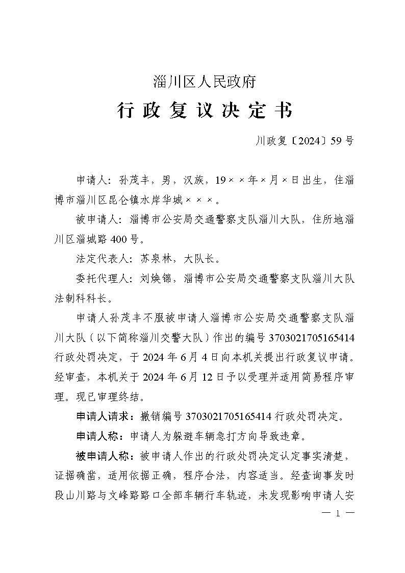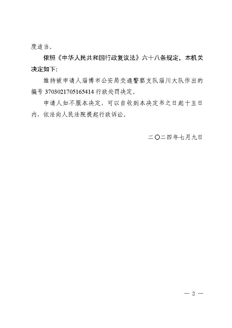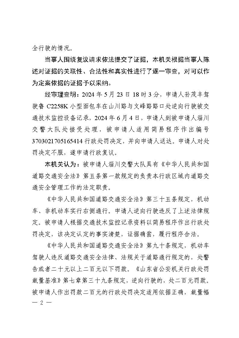 孙茂丰复议淄博市公安局交通警察支队淄川大队罚款行政复议决定书