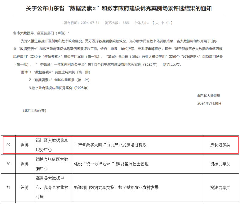 近日,山东省公布了山东省“数据要素×”和数字政府建设优秀案例场景评选结果,淄川区上榜获奖。其中,“‘产业数字大脑'助力产业发展增智提效”获评2023年数字政府应用优秀案例。