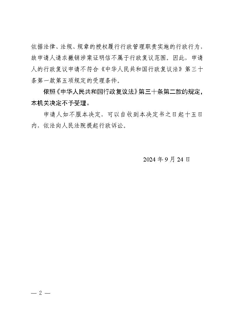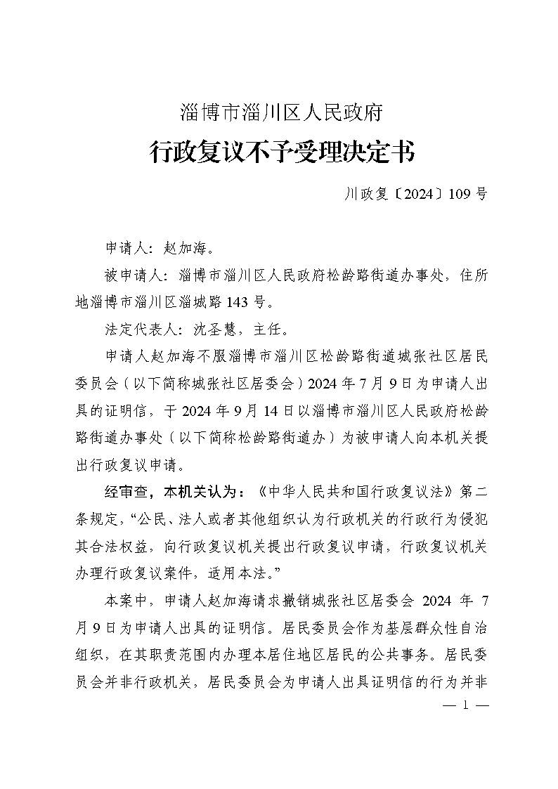赵加海复议淄川区人民政府松龄路街道办事处其他行政复议不予受理决定书