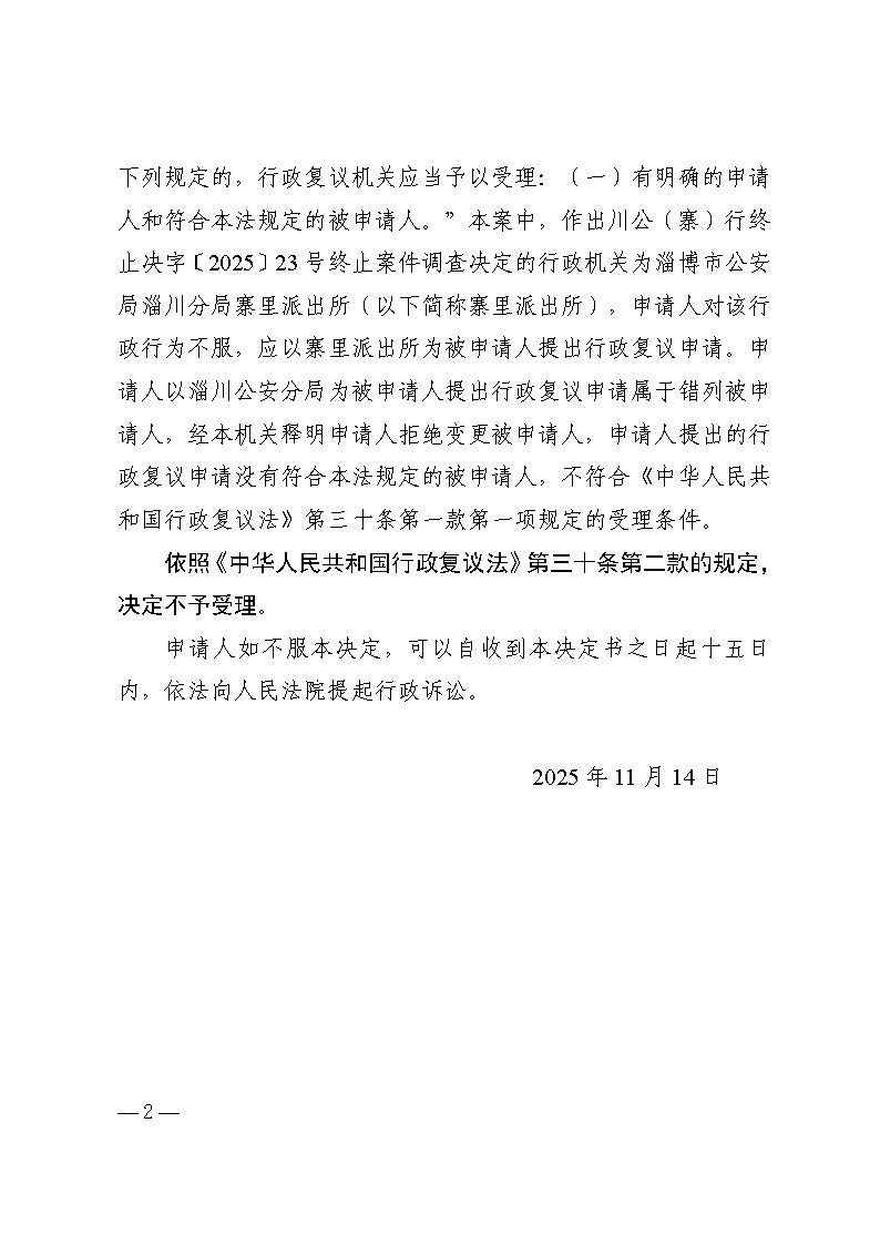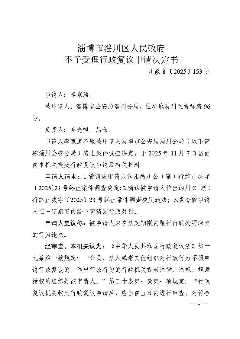 李京涛复议淄博市公安局淄川分局终止案件调查决定不予受理行政复议申请决定书