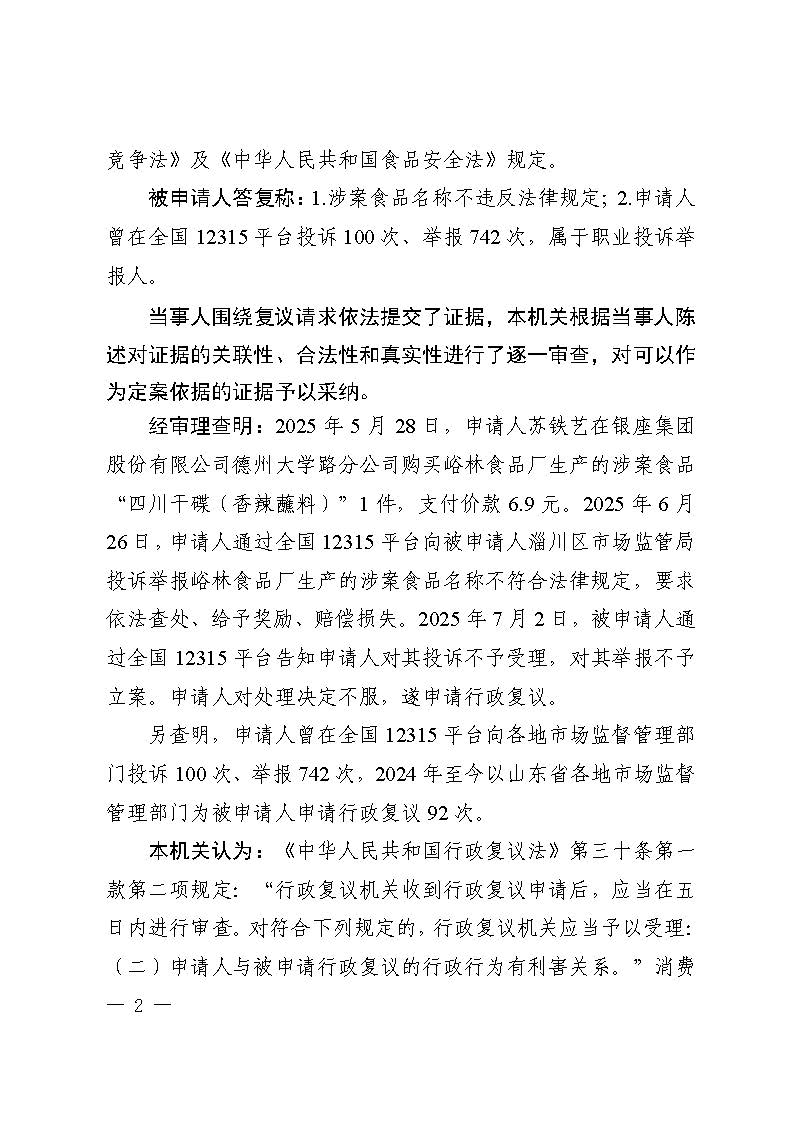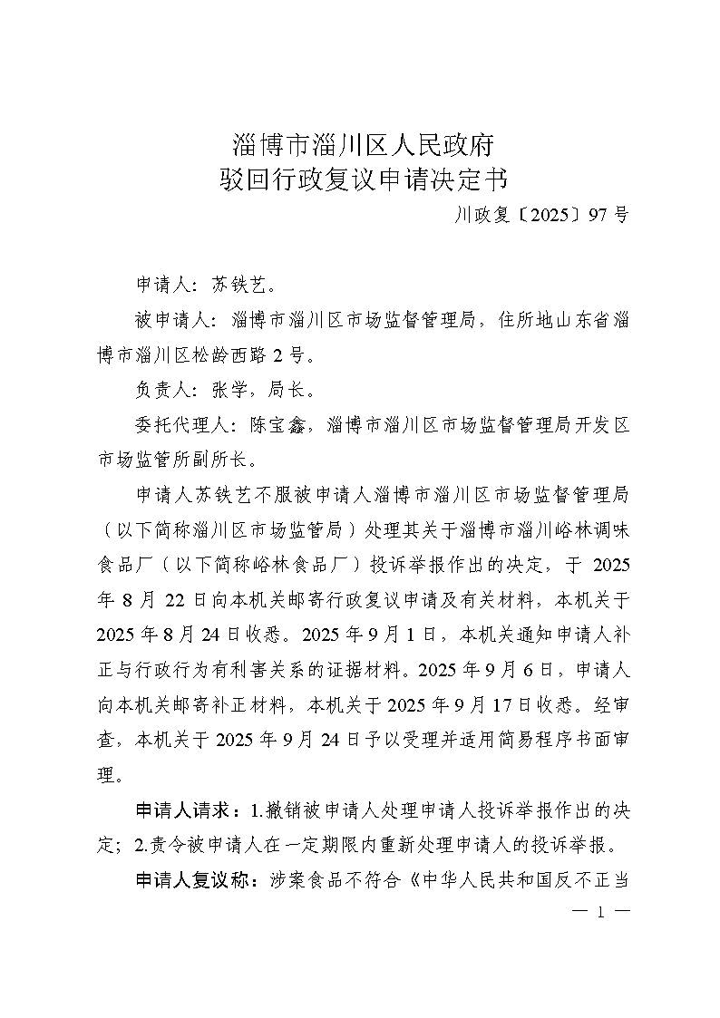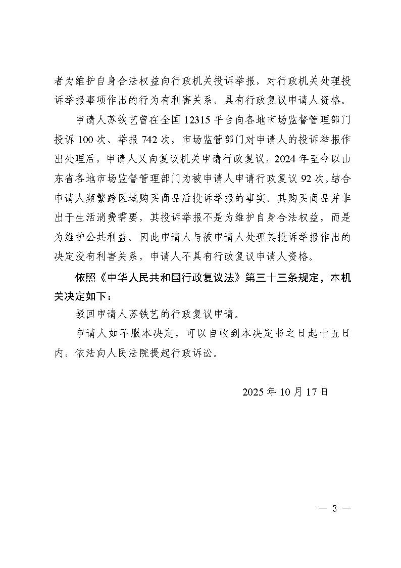 苏铁艺复议淄博市淄川区市场监督管理局举报投诉处理行政复议决定书