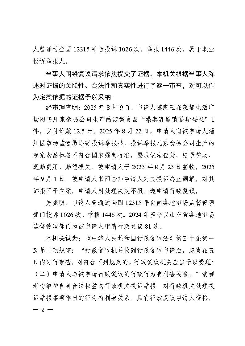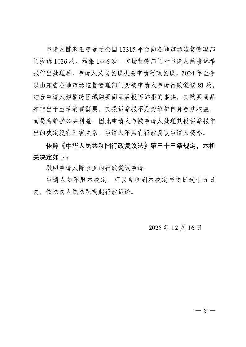陈家玉复议淄博市淄川区市场监督管理局举报投诉处理驳回行政复议申请决定书