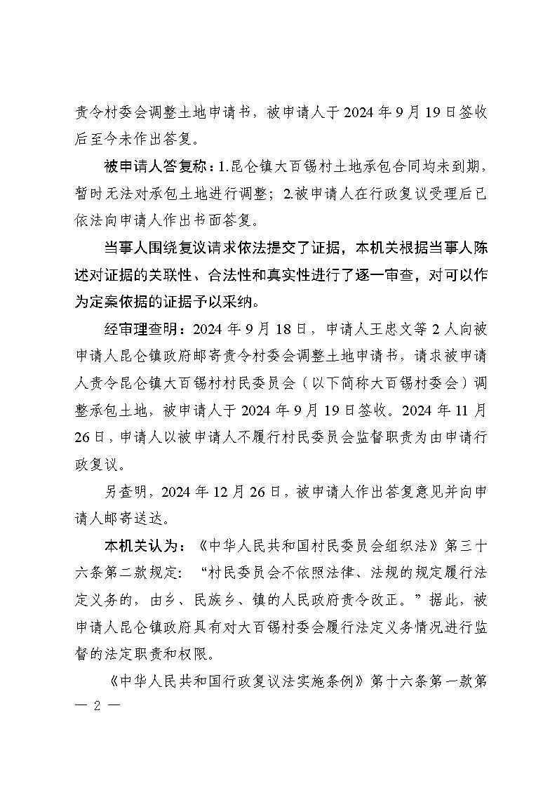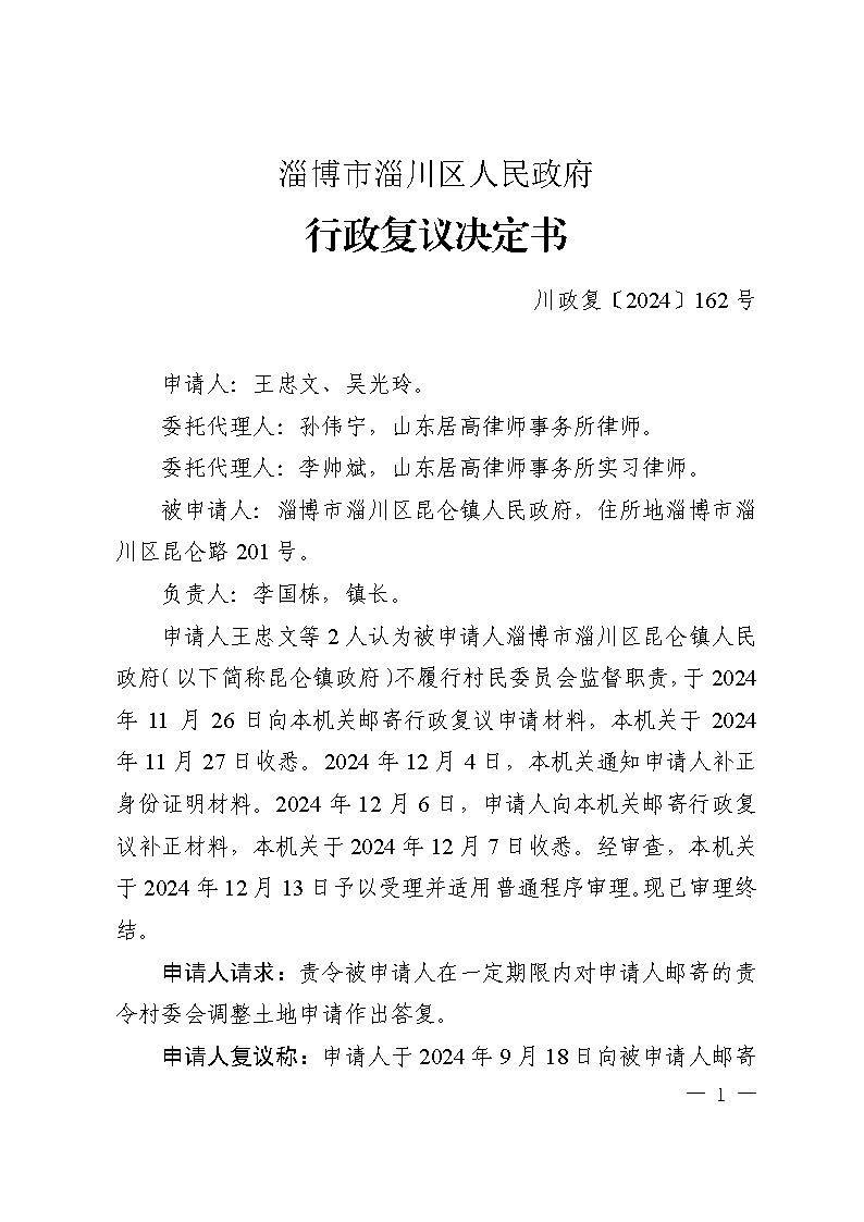 王忠文、吴光玲复议淄博市淄川区昆仑镇人民政府不履行法定职责行政复议决定书