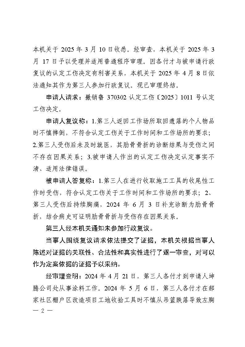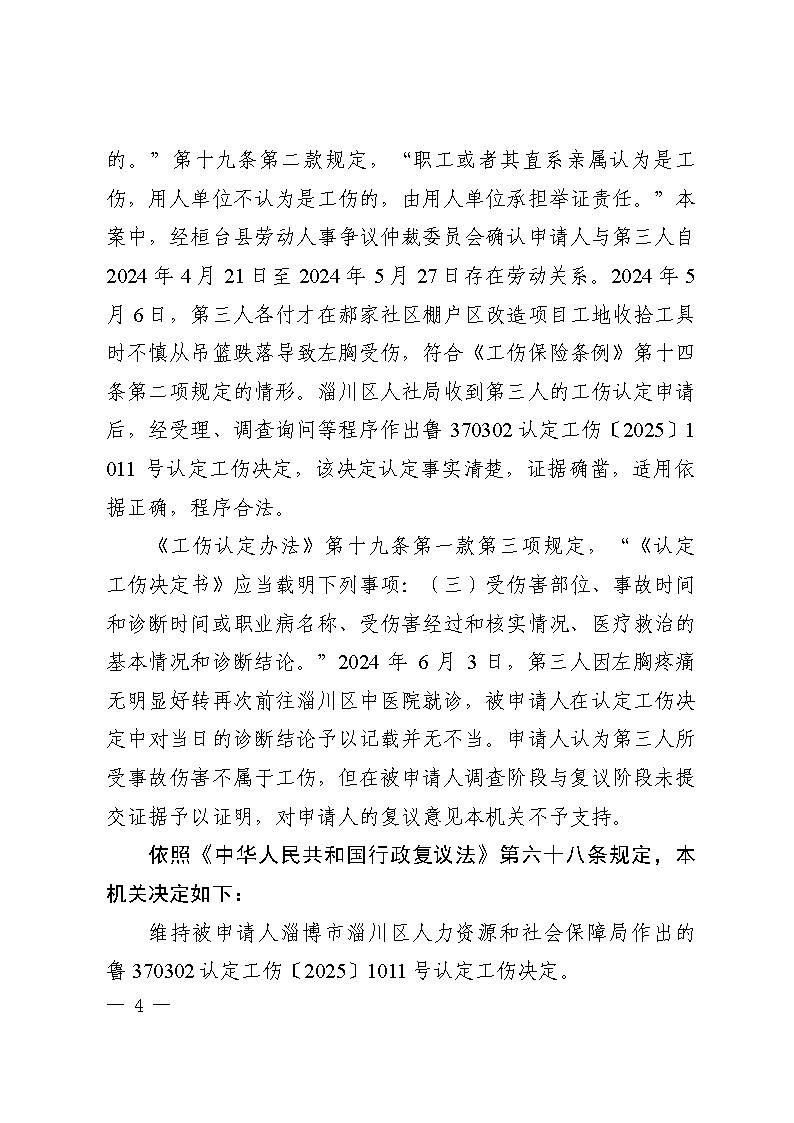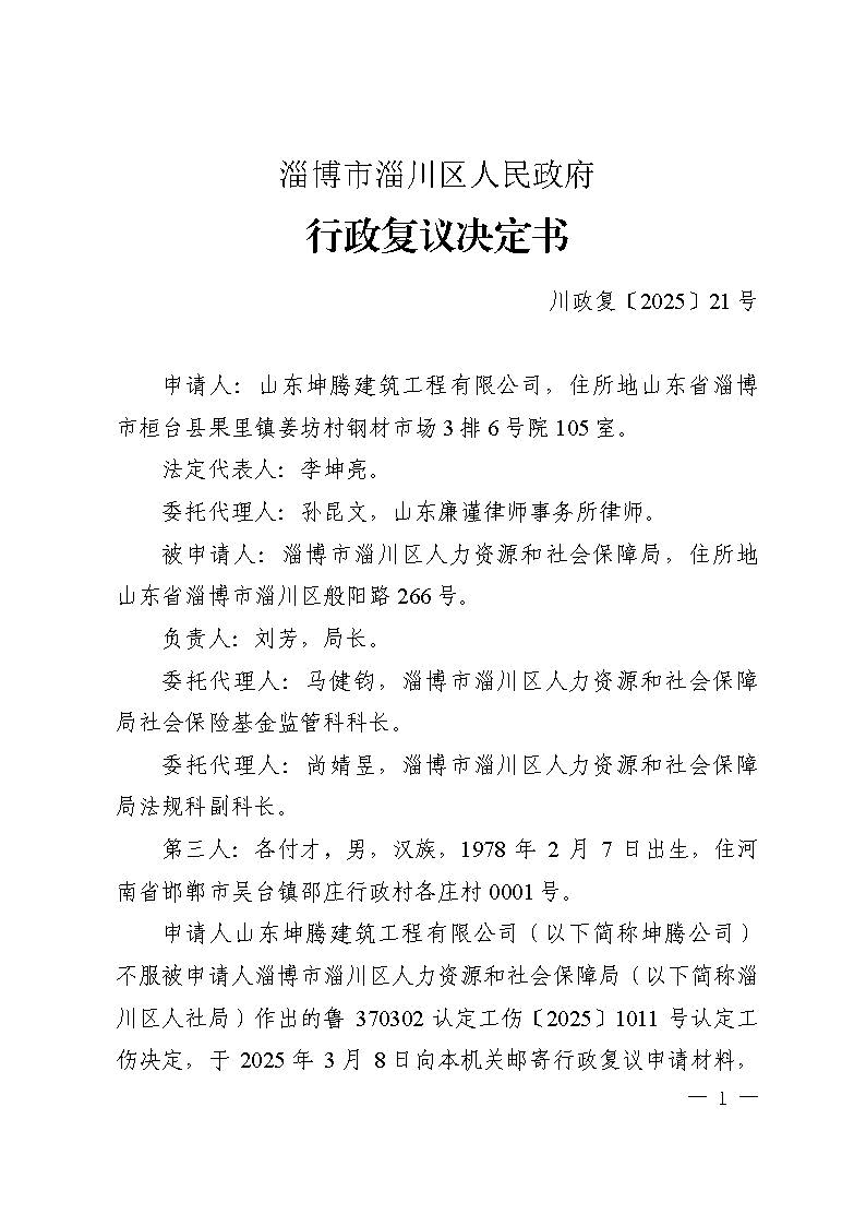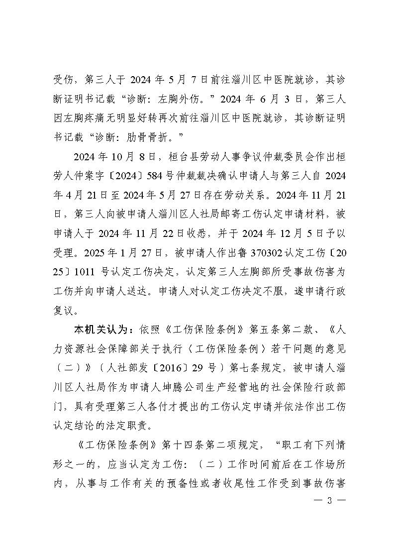 山东坤腾建筑工程有限公司复议淄博市淄川区人力资源和社会保障局工伤保险资格认定行政复议决定书