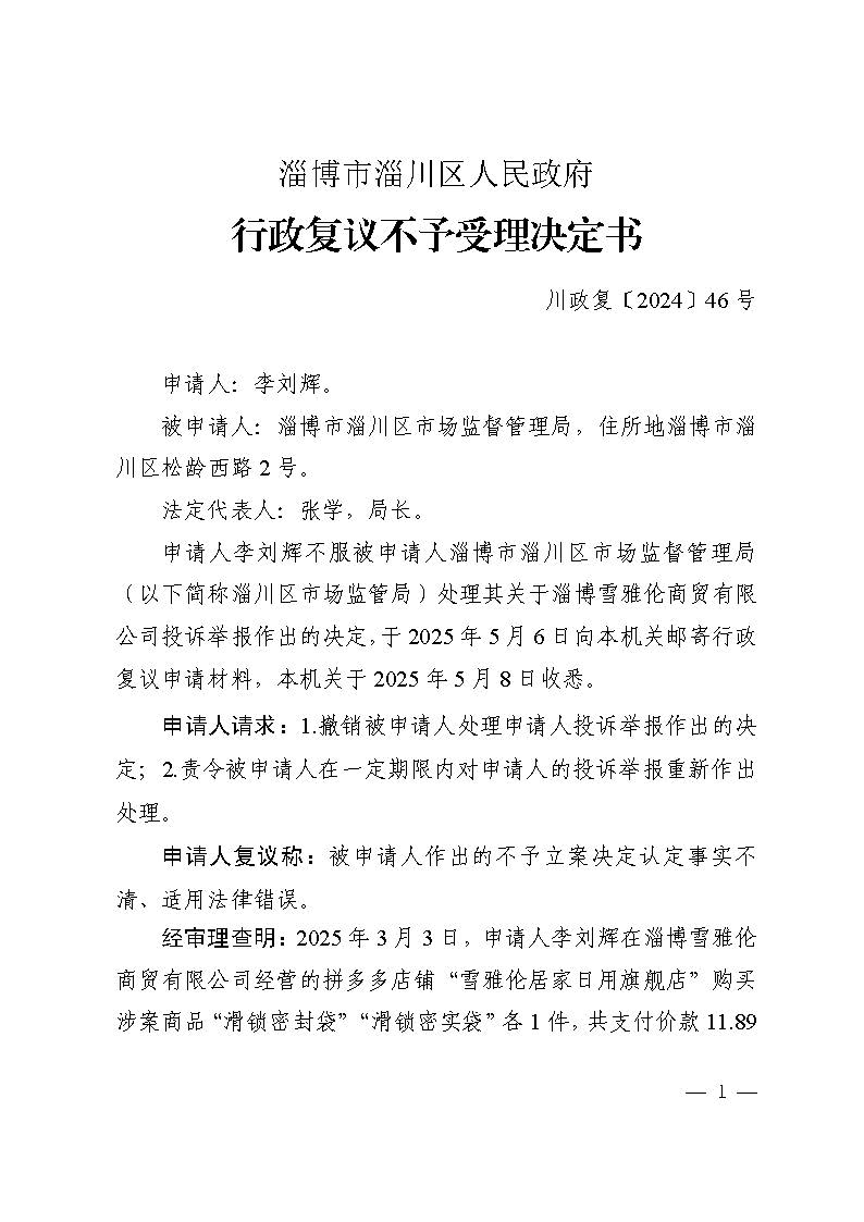 李刘辉复议淄博市淄川区市场监督管理局举报投诉处理行政复议不予受理决定书