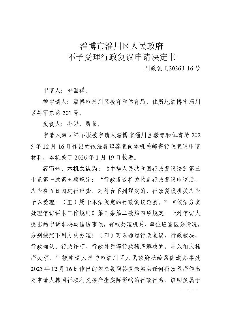 韩国祥复议淄博市淄川区教育和体育局信访事项不予受理行政复议申请决定书