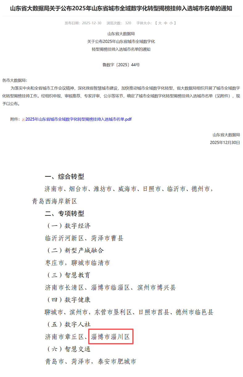 | 淄川区入选山东省城市全域数字化转型揭榜挂帅城市 | |||