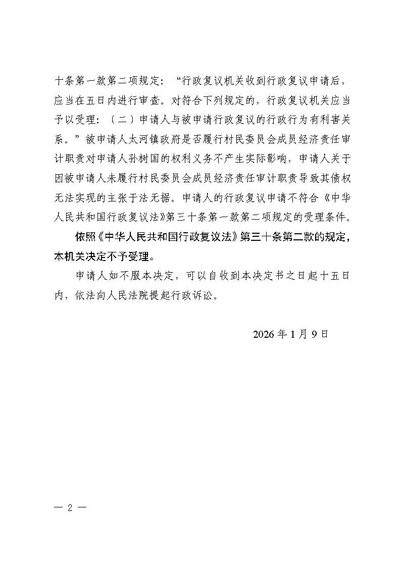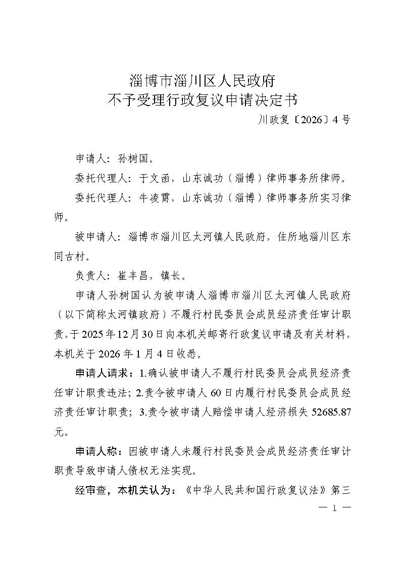 孙树国复议淄博市淄川区太河镇人民政府不履行法定职责不予受理行政复议申请决定书