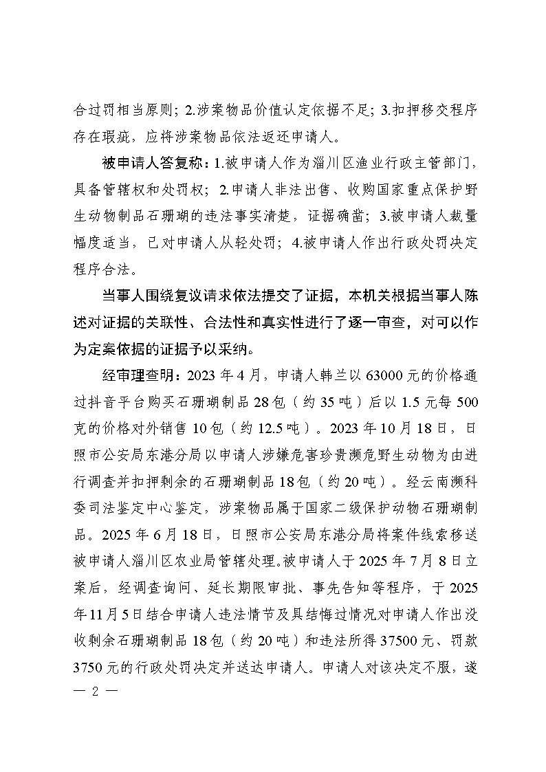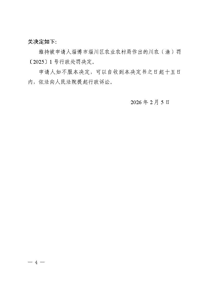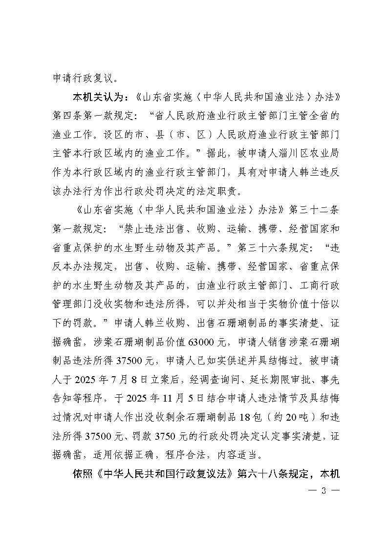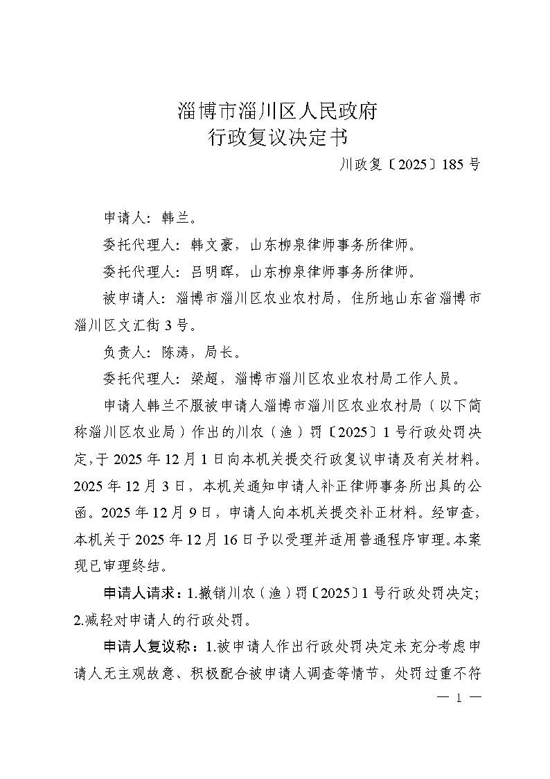 韩兰复议淄博市淄川区农业农村局没收违法所得、罚款行政复议决定书