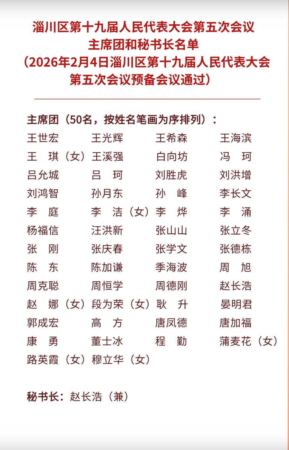 淄川区第十九届人民代表大会第五次会议主席团和秘书长名单