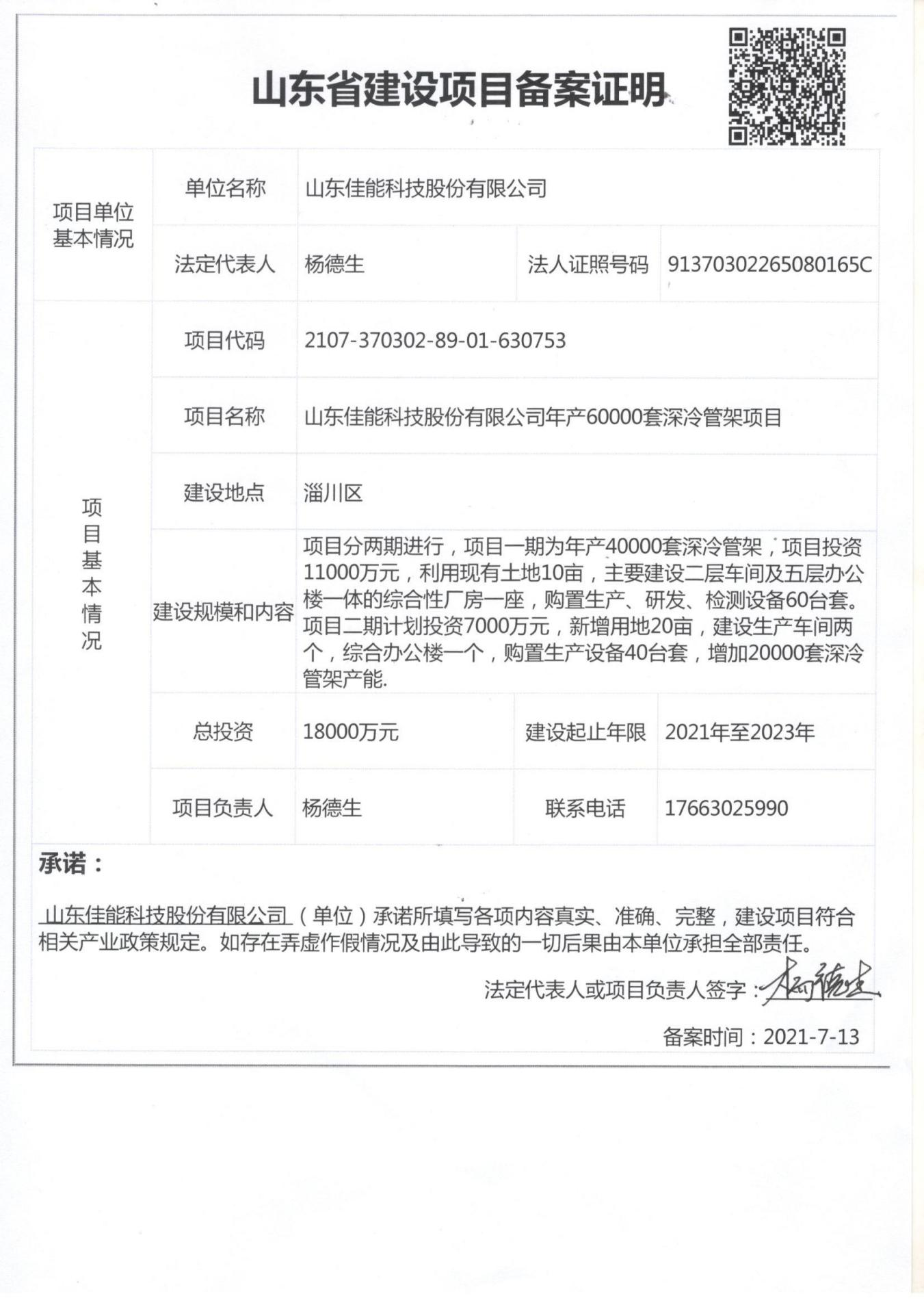 山东佳能科技股份有限公司深冷管架建设项目立项备案信息
