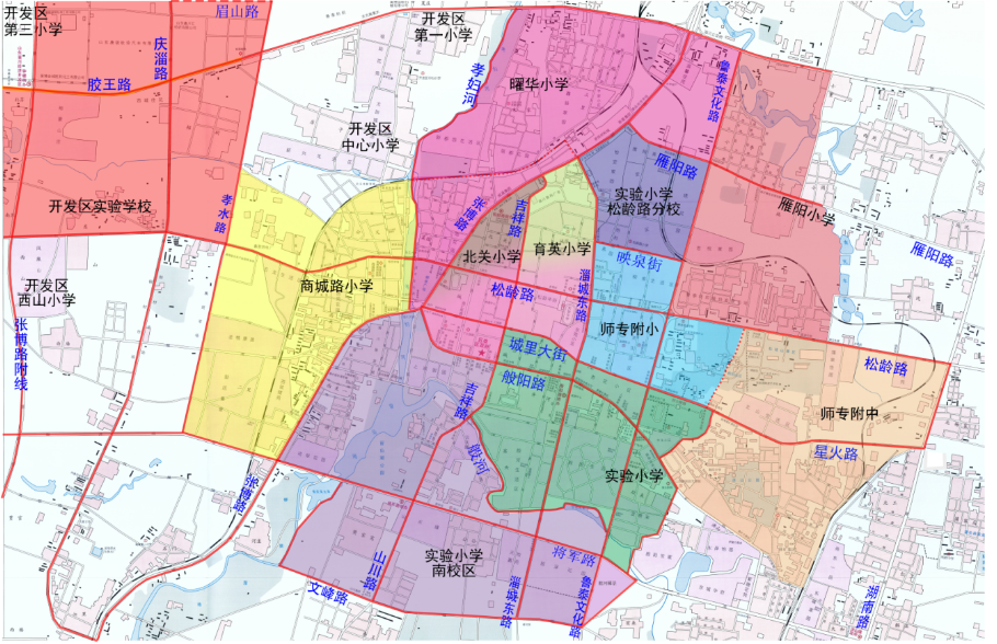 (九)淄川区商城路小学:将军路街道办事处行政区划范围内张博路、孝妇河一线以西(张博路与孝妇河交汇处南以张博路为界,北以孝妇河为界)。