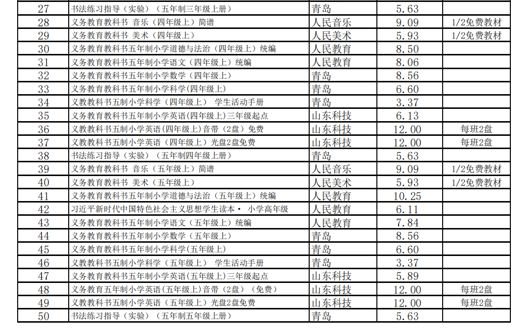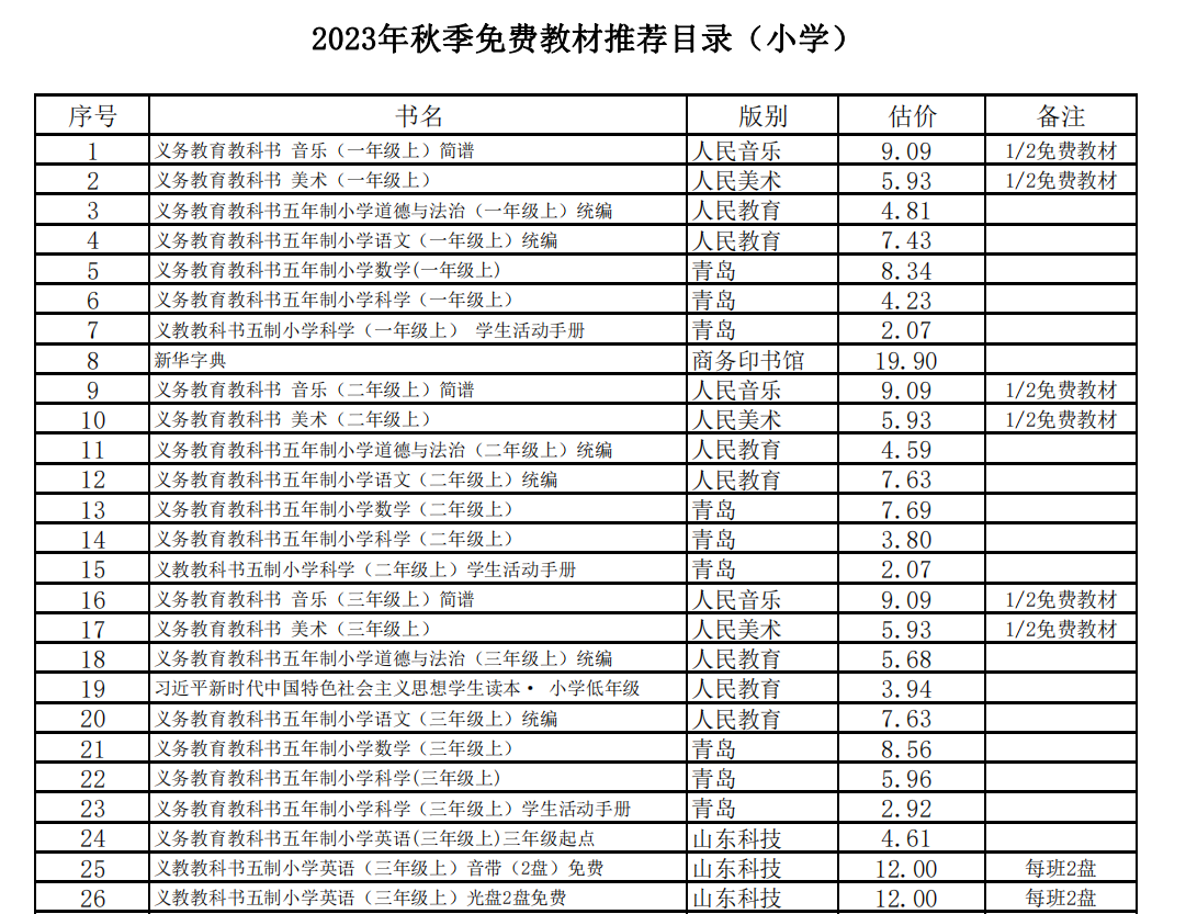 淄川区曜华小学2023秋季免费教材目录
