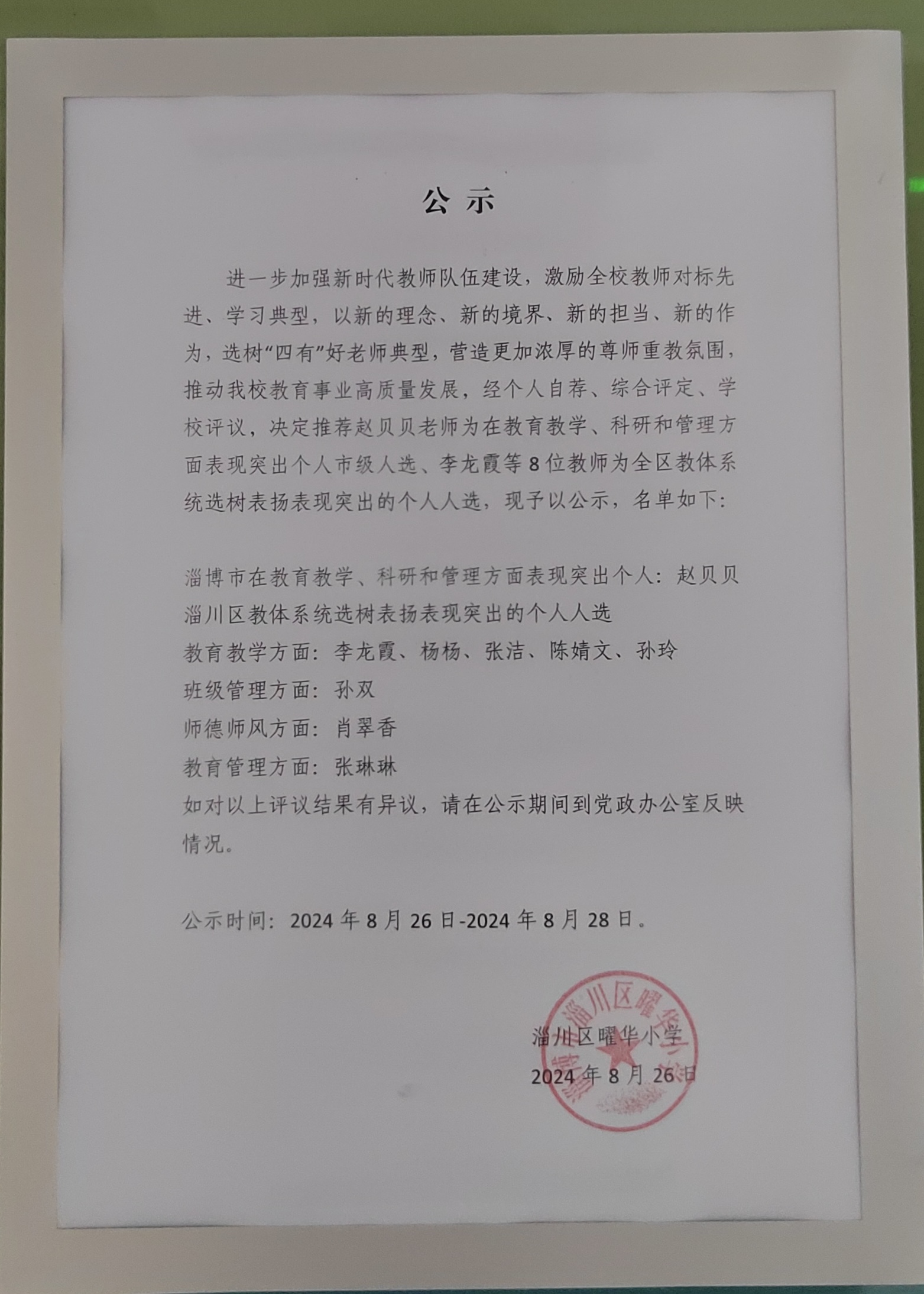 淄川区曜华小学全区教体系统选树表扬表现突出的个人人选公示