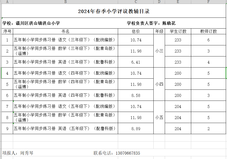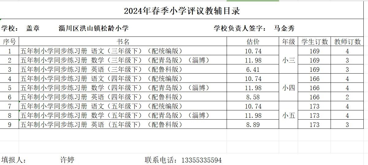 淄川区洪山镇中心学校2024年教材教辅选用、使用目录