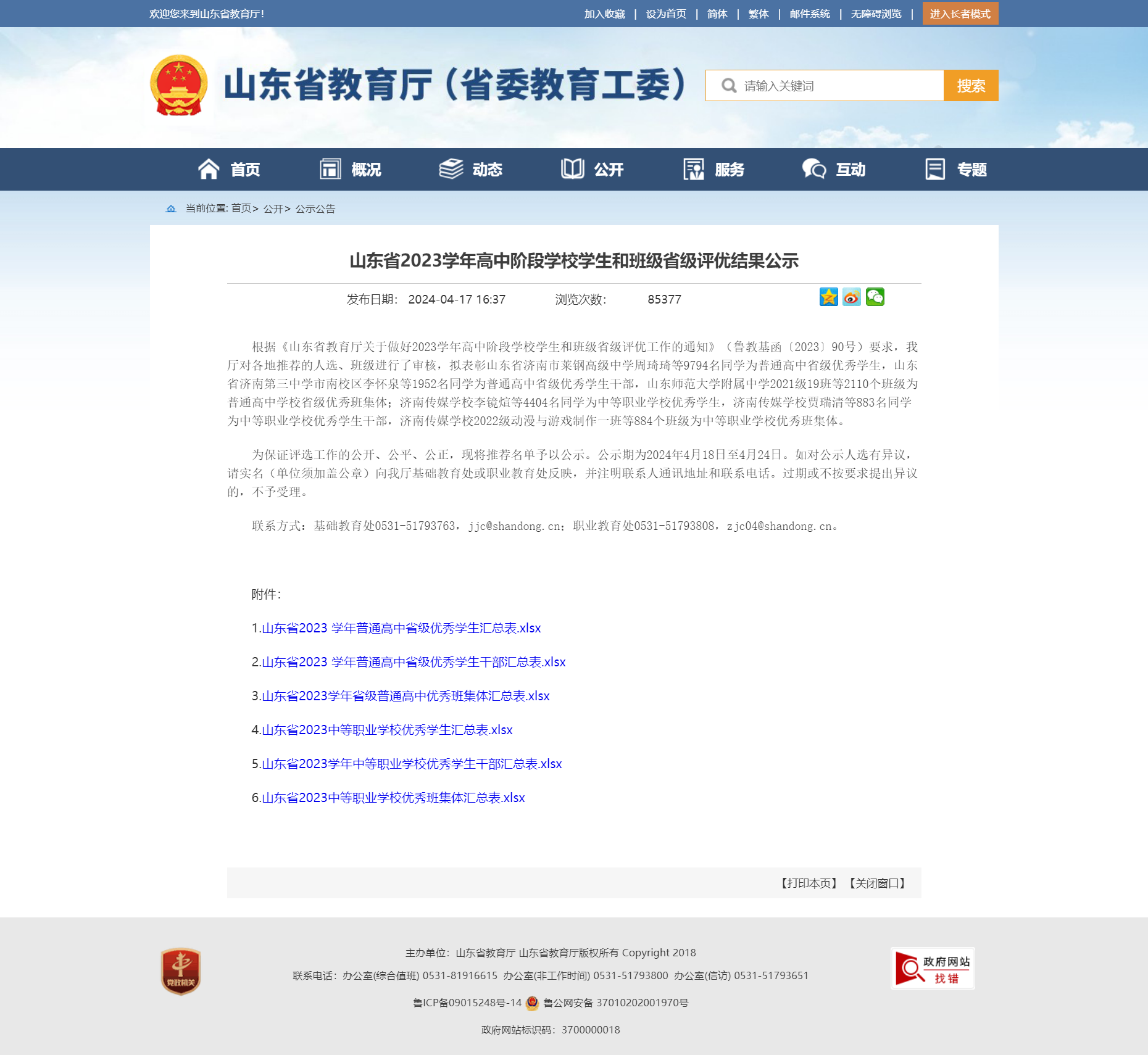 山东省2023学年高中阶段学校学生和班级省级评优结果公示