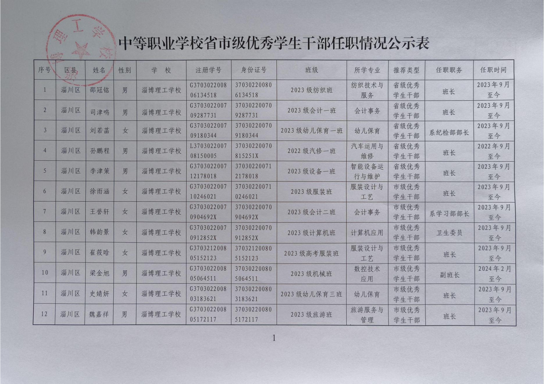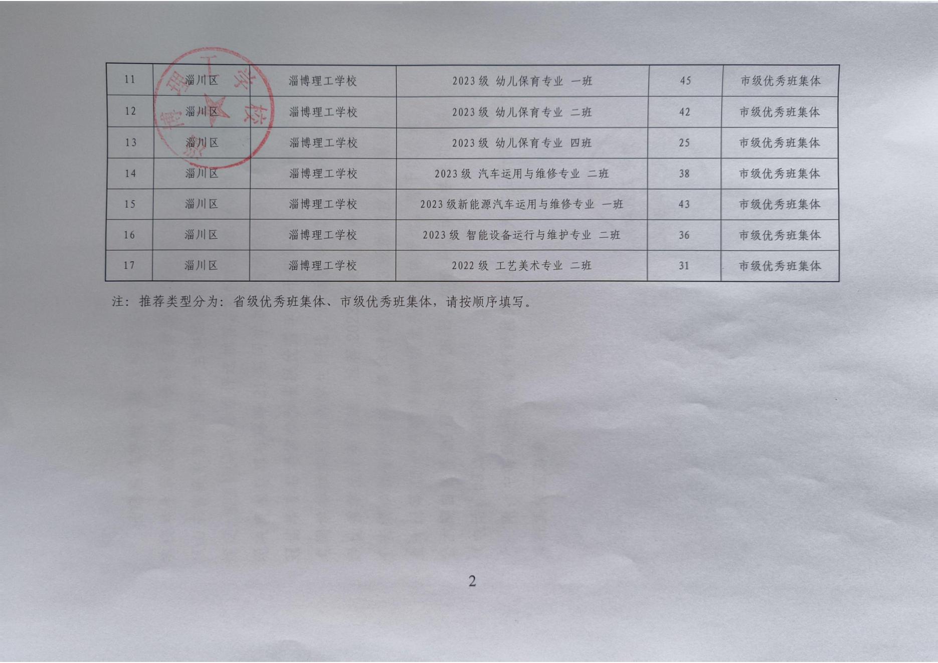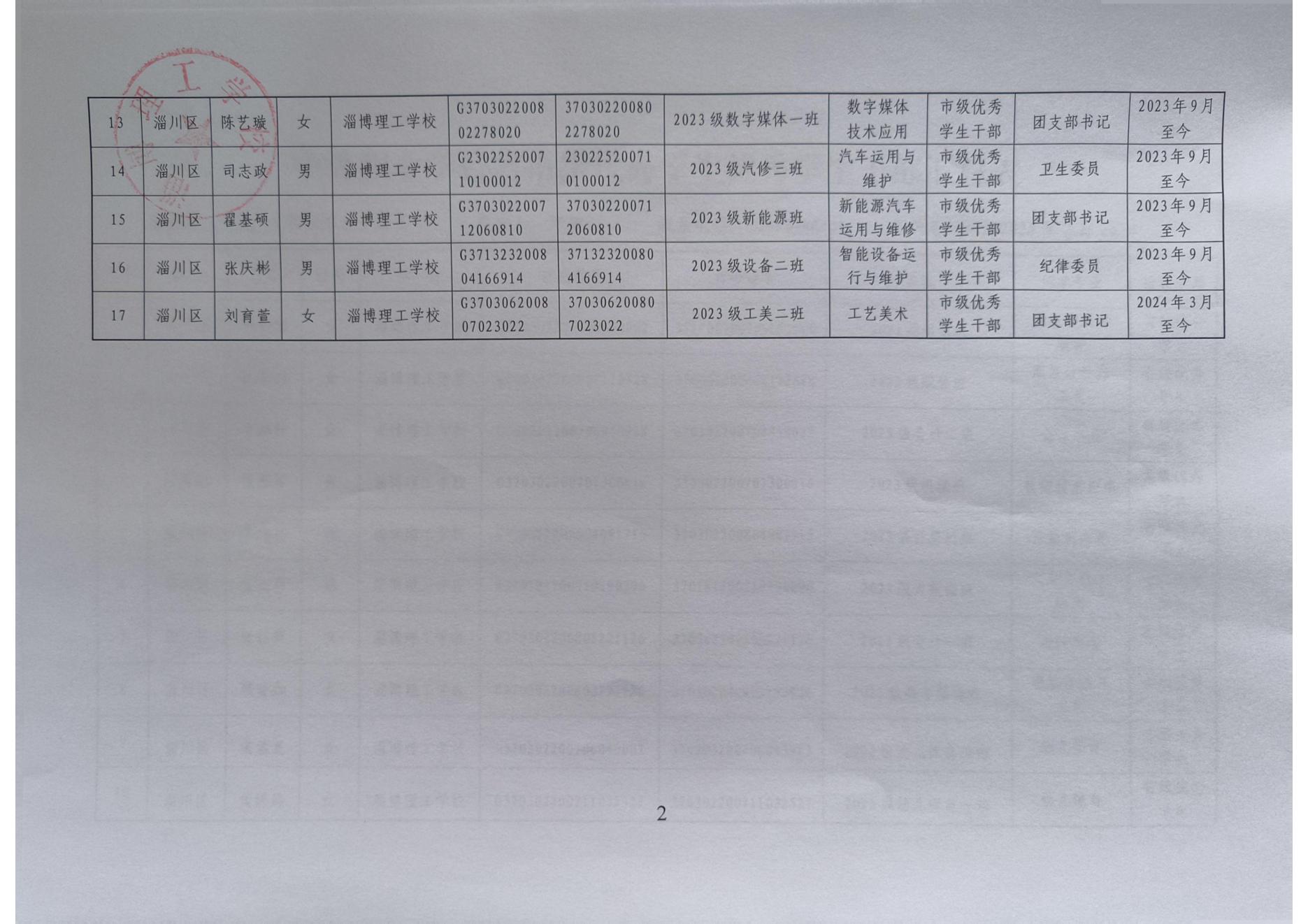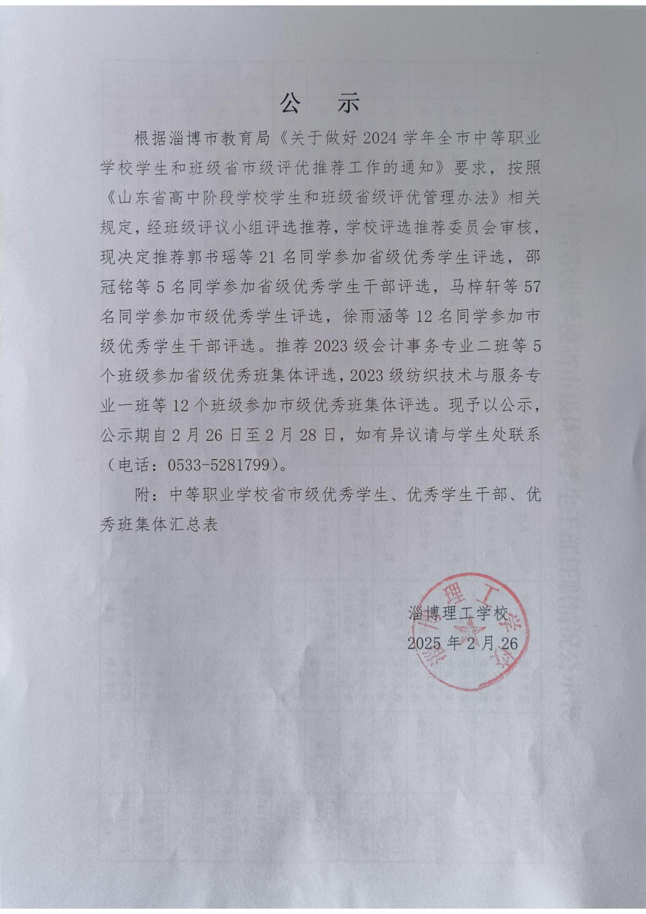 淄博理工学校拟推荐省市级普通中学及中等职业学校优秀学生、优秀学生干部、优秀班集体公示
