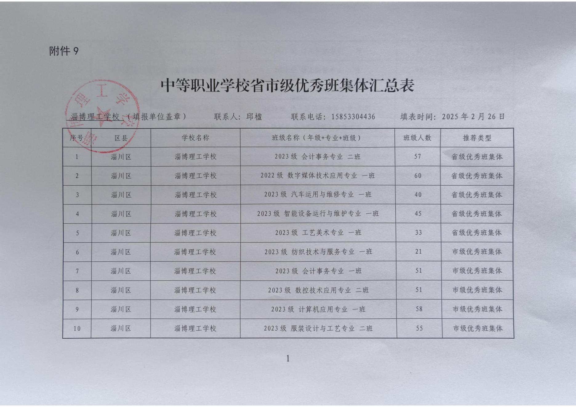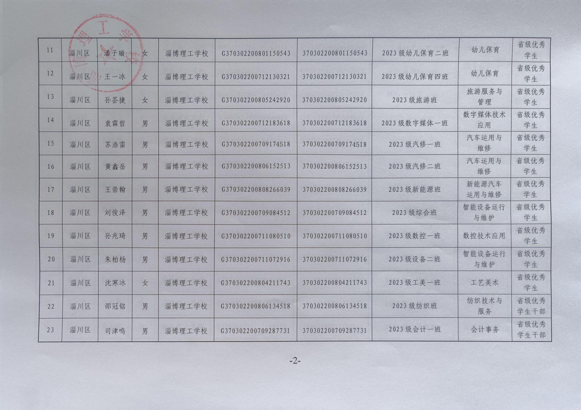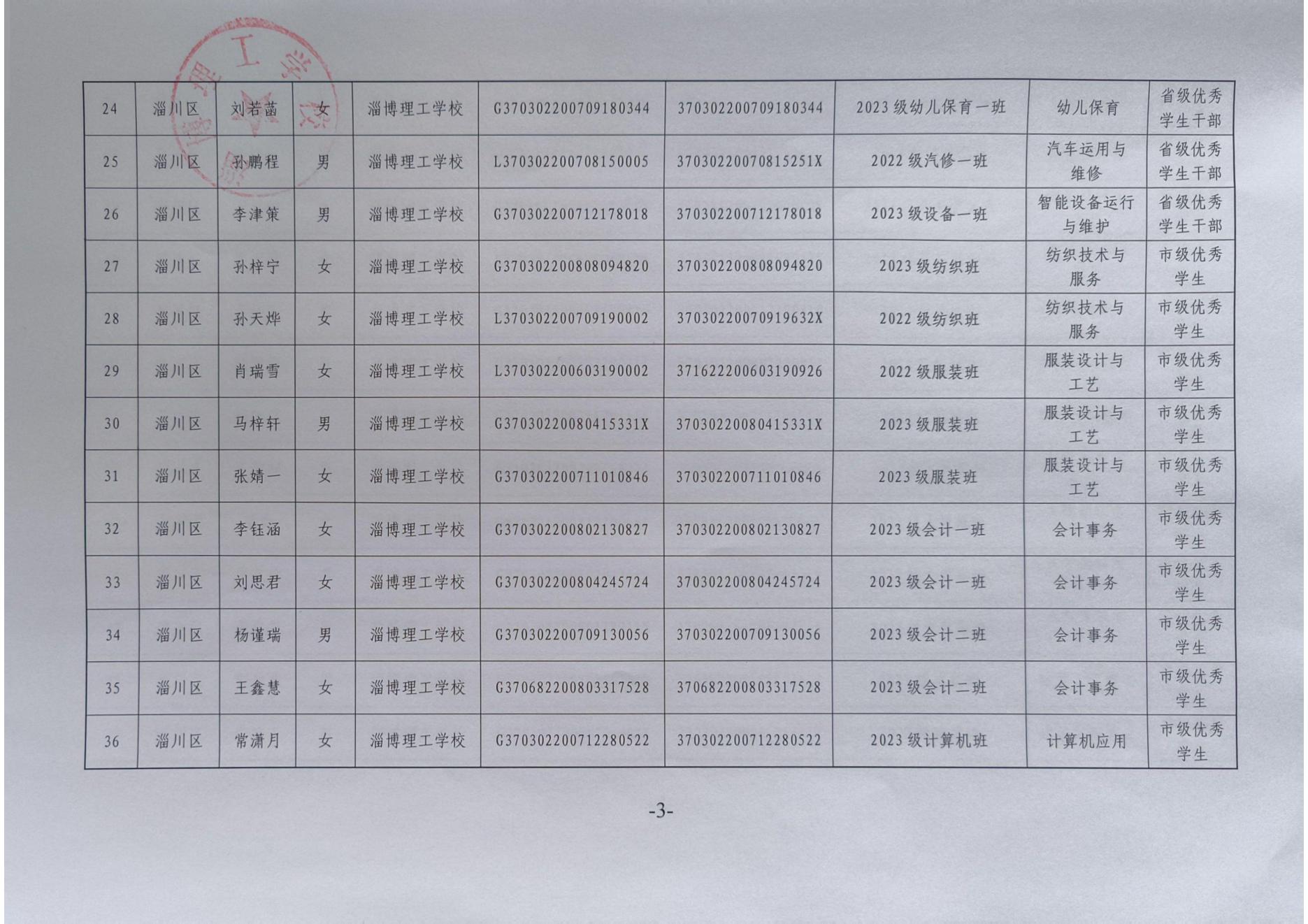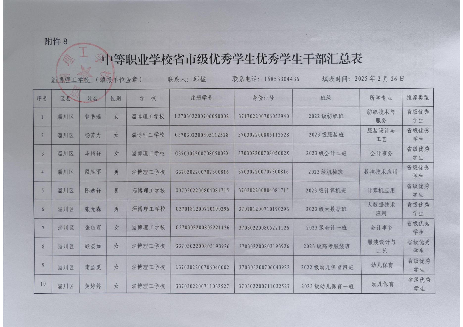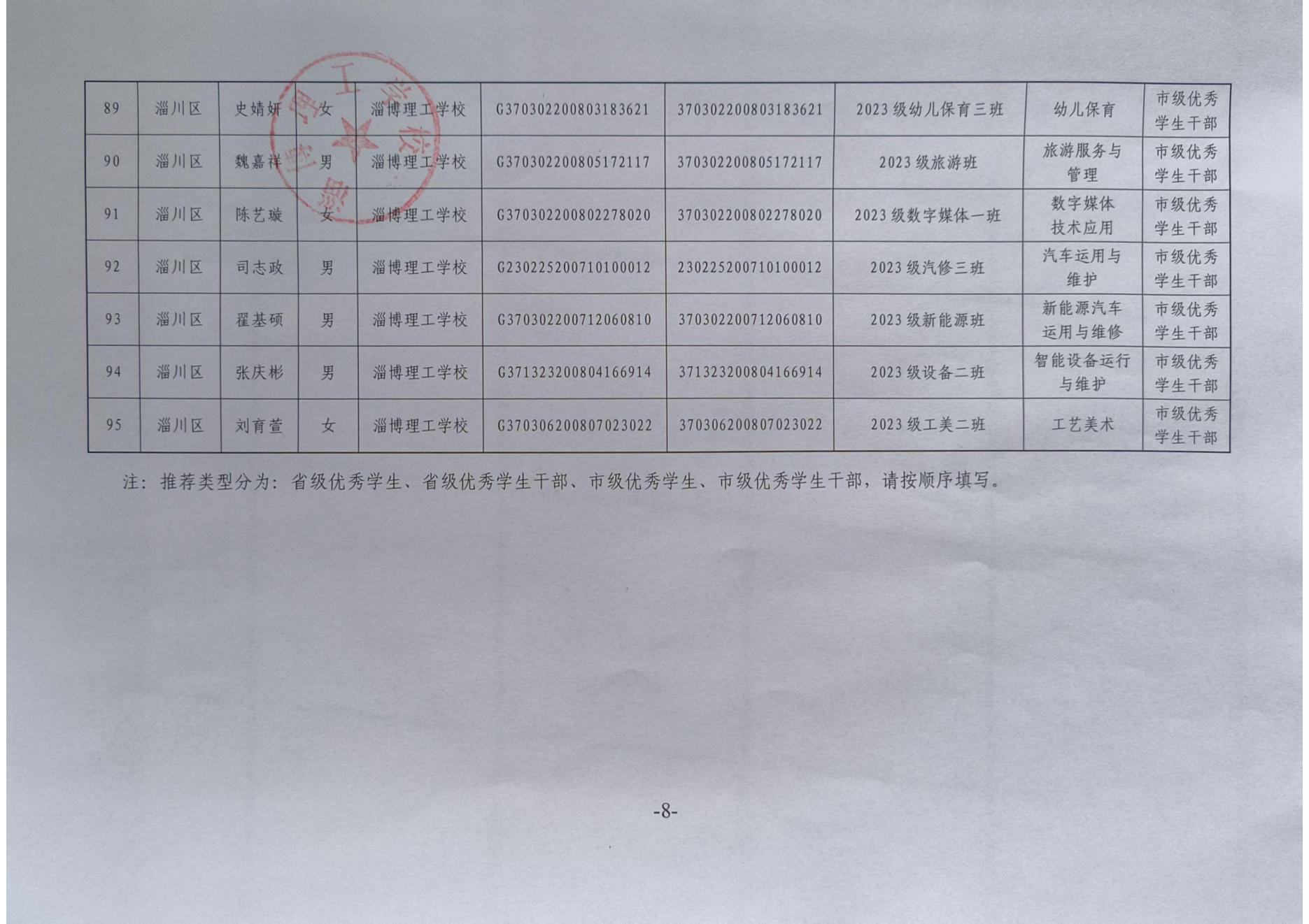 淄博理工学校拟推荐省市级普通中学及中等职业学校优秀学生、优秀学生干部、优秀班集体公示