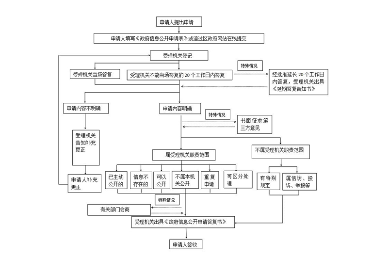 本机关办理申请人政府信息公开申请时,能够当场答复的,将当场答复;不能当场答复的,自收到申请之日起20个工作日内予以答复;确需延长答复期限的,延长答复时间不超过20个工作日,并告知申请人。政府信息涉及第三方权益的,应当征求第三方的意见,征求第三方意见所需时间不计算在期限内。