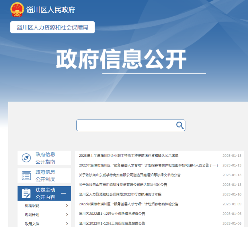 淄川区人力资源和社会保障局在职责范围内负责主动或依申请公开下列各类政府信息: