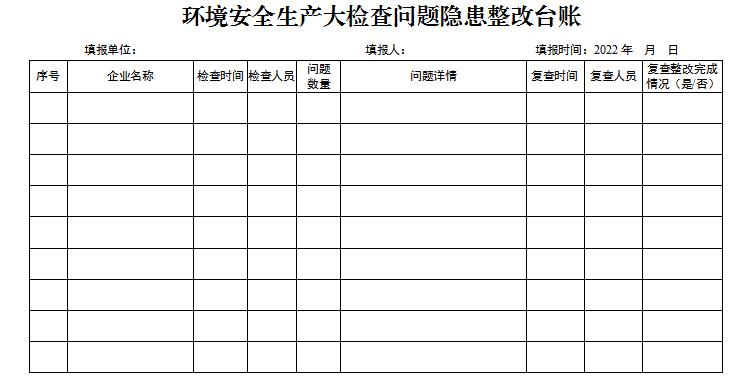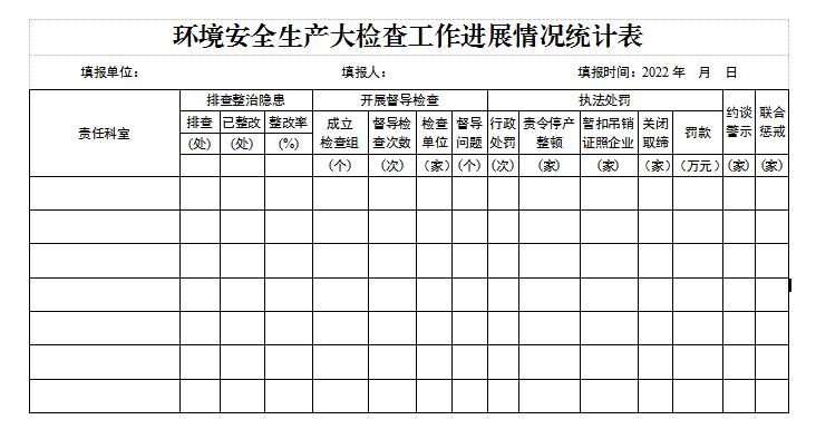 (四)强化调度通报,营造良好氛围。区安委会办公室将建立定期调度通报制度,及时掌握进展情况,定期梳理汇总,在全区通报。各分管领导、督导检查组、各责任科室从5月份开始,每月12日和27日前(遇节假日提前)填报《环境安全生产大检查工作进展情况统计表》(附件2)和《环境安全生产大检查问题隐患整改台账》(附件3)报局督查办,汇总后报区安委会办公室。
