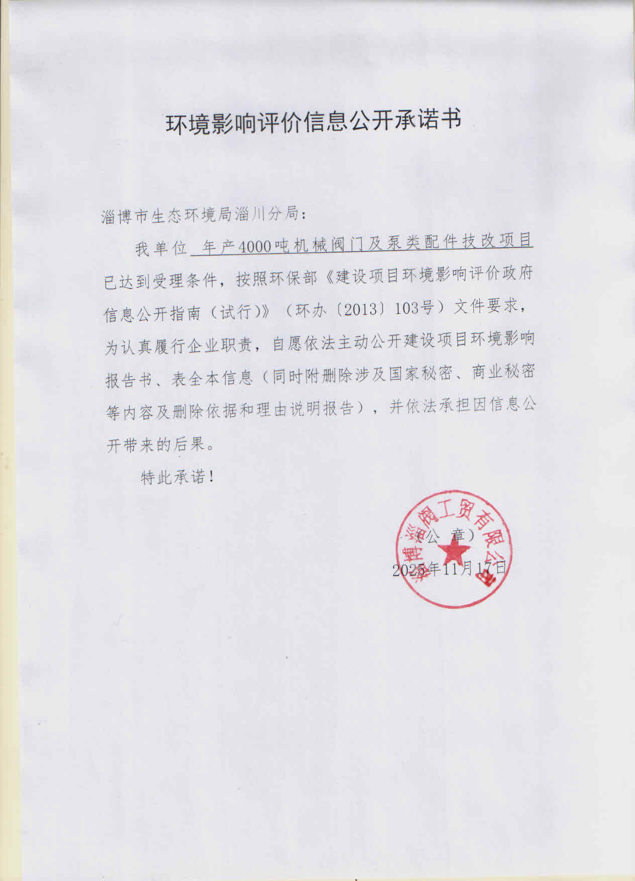 | 标题: | 2025年11月26日淄博市生态环境局淄川分局关于淄博淄阀工贸有限公司年产4000吨机械阀门及泵类配件技改项目环境影响评价文件受理情况的公示 | ||