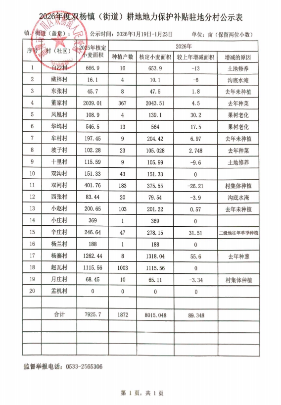 淄川区2025年度双杨镇耕地地力保护补贴发放公示表