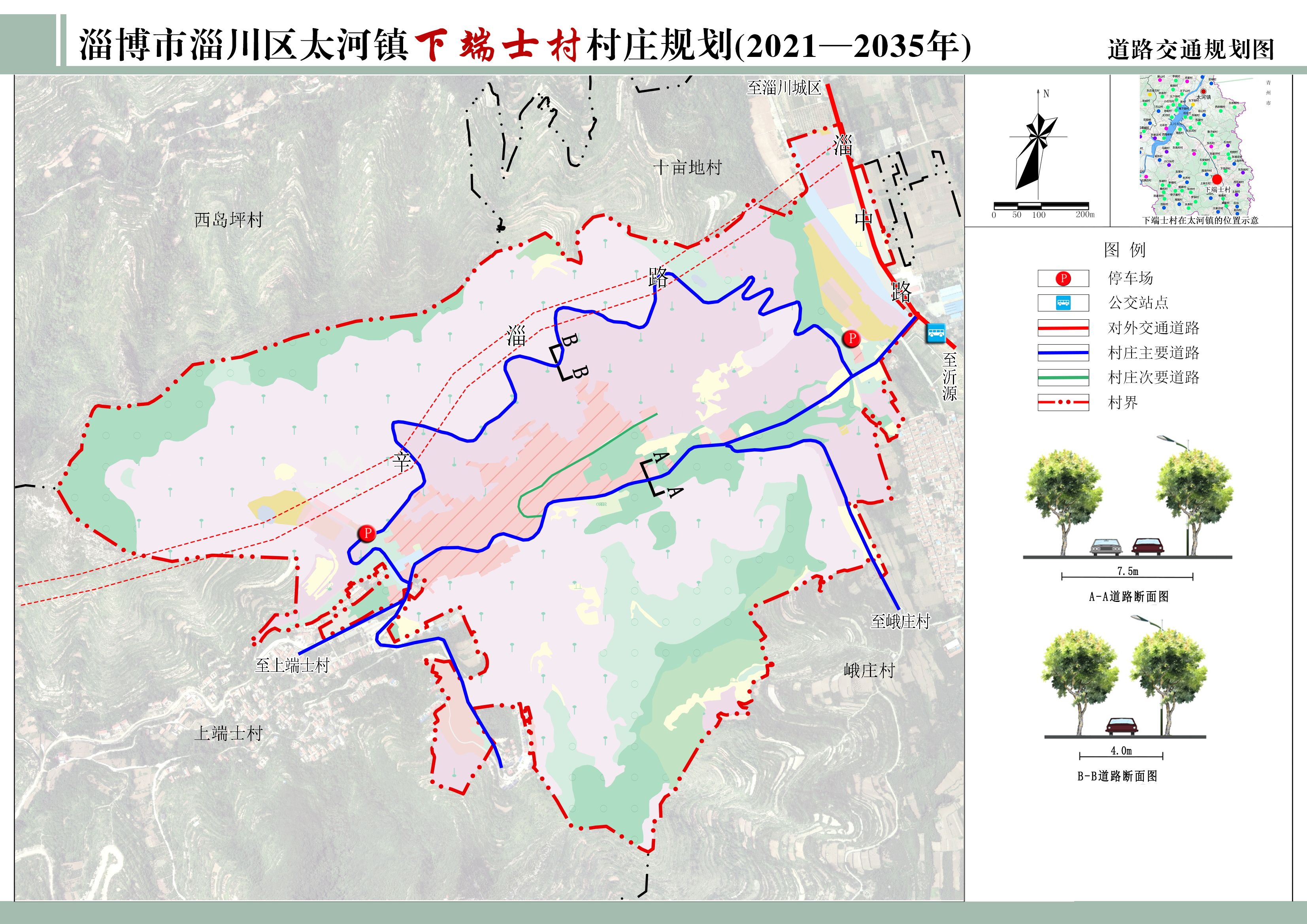 (1)对外交通:下端士村对外交通基础良好,规划延续原有对外交通体系,主要依托淄中路。