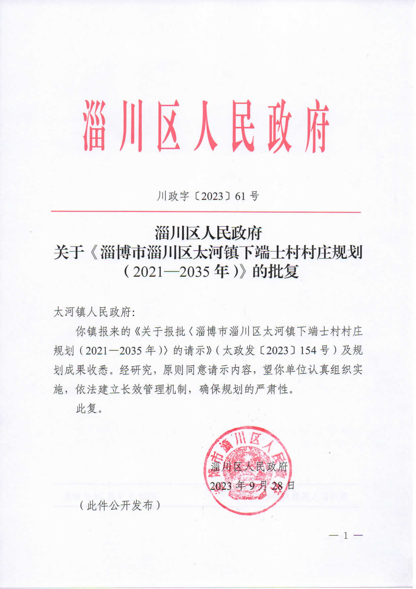 《淄博市淄川区太河镇下端士村村庄规划(2021—2035年)》的批复