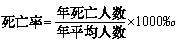 35、死亡率(又称粗死亡率) 指在一定时期内(通常为一年)一定地区的死亡人数与同期内平均人数(或期中人数)之比,用千分率表示。本资料中的死亡率指年死亡率,其计算公式为: