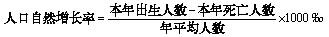 36、人口自然增长率 指在一定时期内(通常为一年)人口自然增加数(出生人数减死亡人数)与该时期内平均人数(或期中人数)之比,用千分率表示。计算公式为: