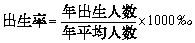 34、出生率(又称粗出生率) 指在一定时期内(通常为一年)一定地区的出生人数与同期内平均人数(或期中人数)之比,用千分率表示。本资料中的出生率指年出生率,其计算公式为: