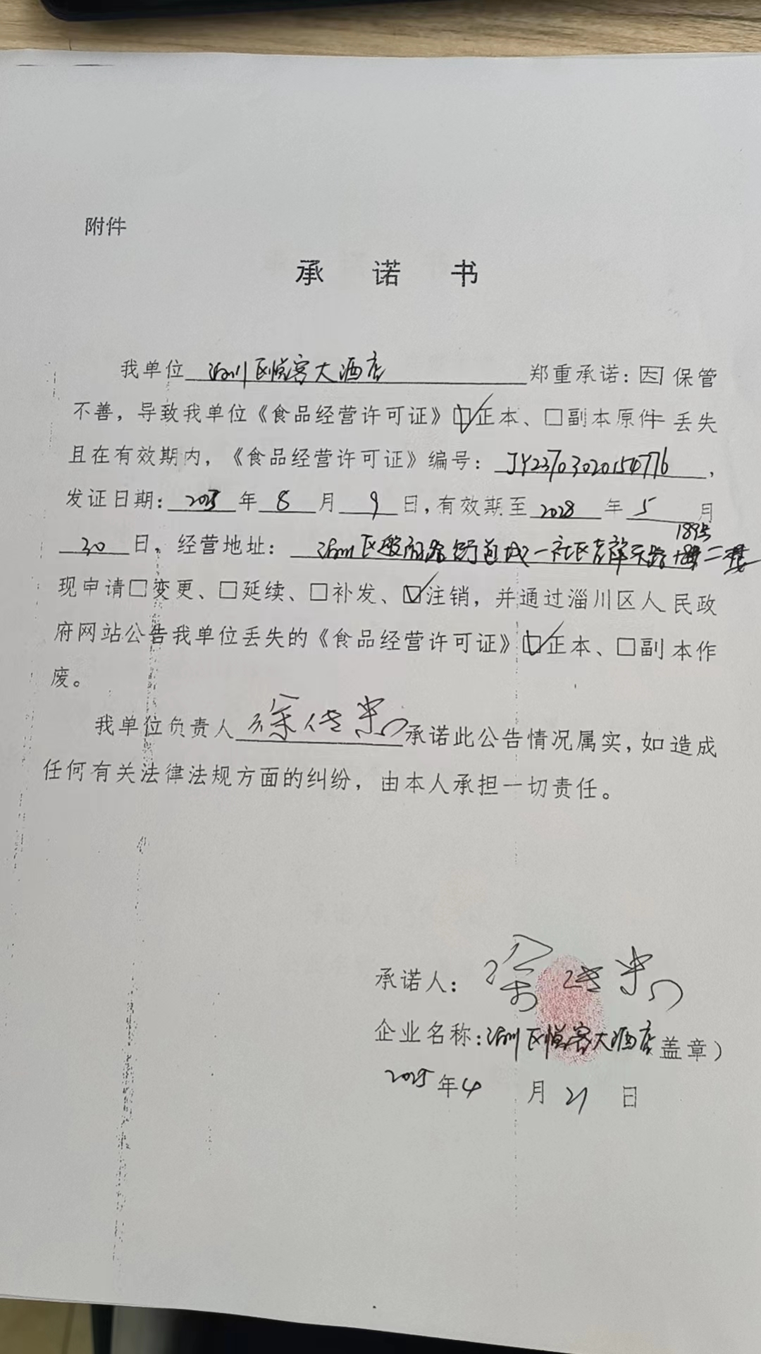 淄川区《食品经营许可证》正、副本遗失公告(淄川区悦客大酒店)
