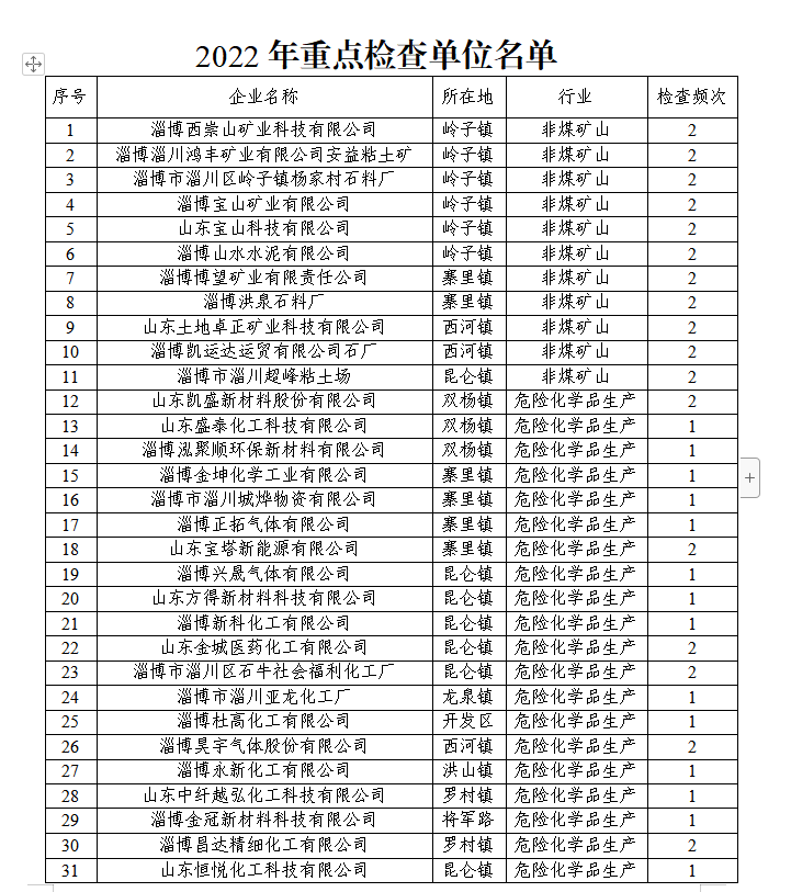 (一)重点检查安排。本年度重点检查单位包括非金属地下矿山和露天矿山企业11家,危险化学品企业28家,其中涉及重点监管危险化学品、重点监管危险化工工艺和危险化学品重大危险源的企业22家,近三年发生生产安全事故企业5家,其中涉及危险化学品企业4家,共计40家,重点检查单位名称、行业及年度检查频次见附件《2022年重点检查单位名单》。