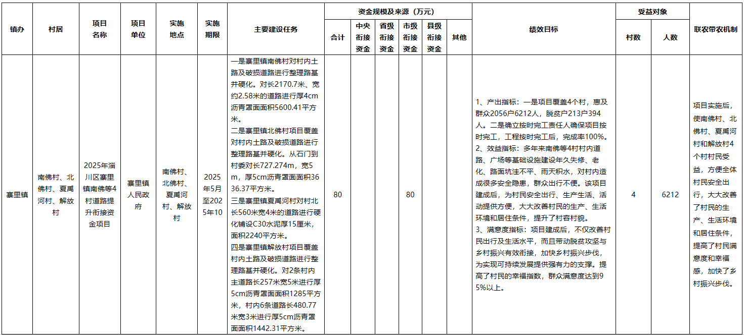 我镇2025年度计划实施2025年淄川区寨里镇南佛等4村道路提升衔接资金项目,项目实施方案已经村内公示、镇级审核通过,现予以上报。